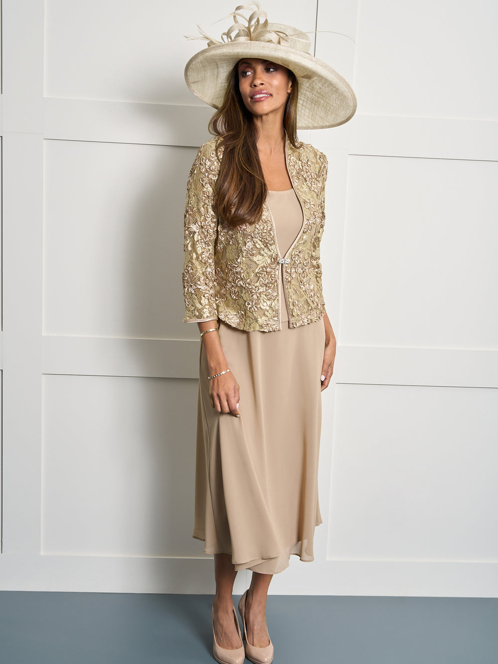 This beautiful ensemble features a soft, flowing, sleeveless chiffon dress in a sophisticated neutral beige tone with a matching jacket. The jacket is crafted from intricate lace with delicate embroidery and subtle embellishments for some sparkle. This two-piece set is a harmonious blend of softness and sophistication. Ideal for the mother of the bride, weddings, or any elegant occasion. Measuring 118cm