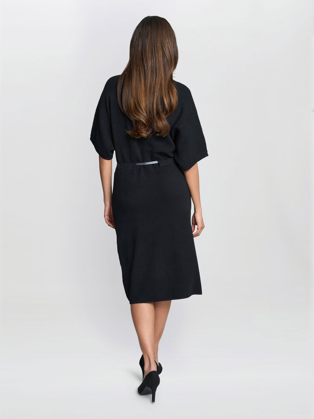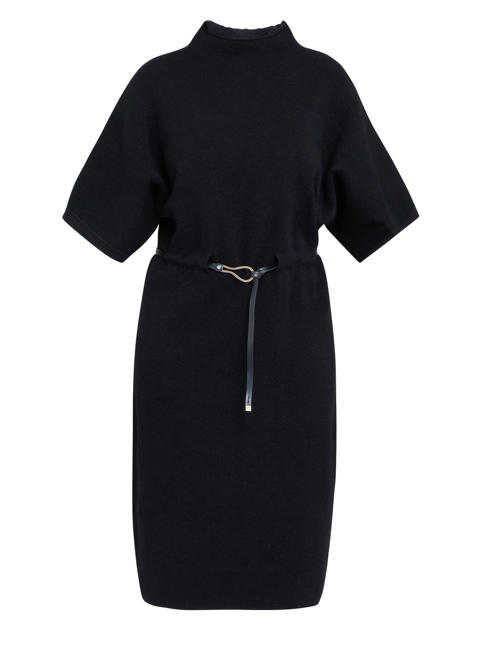 Sleek, sophisticated and versatile, this dress is a wardrobe staple for effortless elegance. Made from a soft knit, this black midi dress features a high neckline and wide short sleeves. The slim gold belt cinches the waist for a refined silhouette, making it perfect for both office and evening wear.