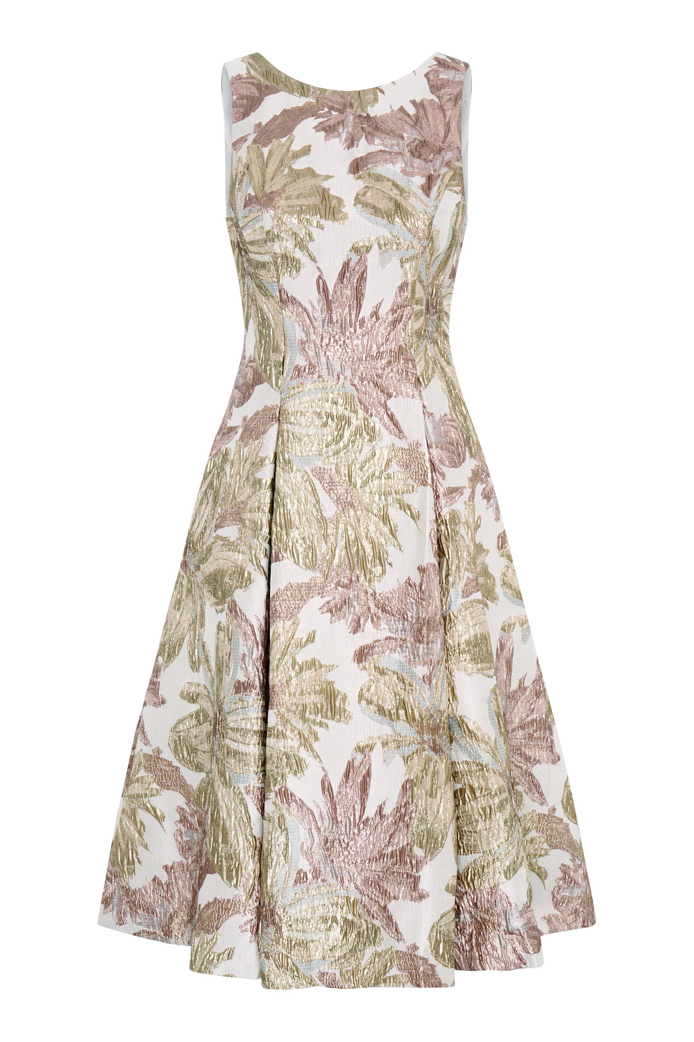 This beautiful dress is made from a quality jacquard fabric with a metallic thread, perfect for any party. It is sleeveless, has a round neckline, and is pleated at the waist. This midi-length dress has a floral print pattern in shades of pink and gold, making it a perfect choice for any special occasion. This dress is unlined and measures 105cm.