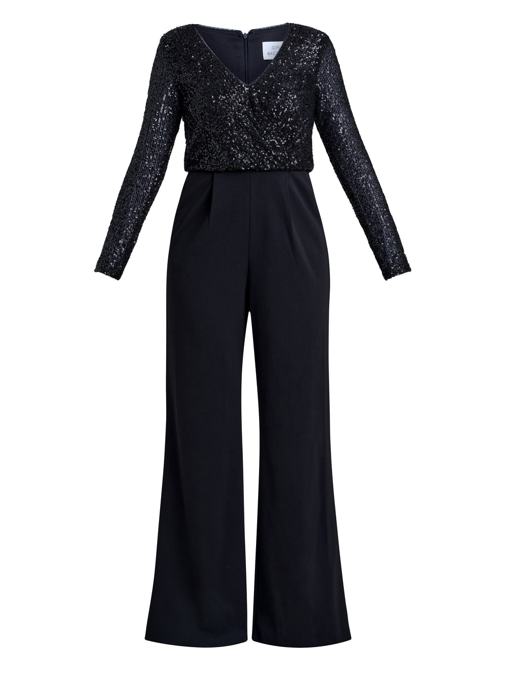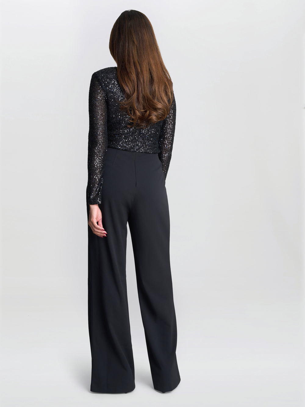 Elevate your eveningwear with the chic Allegra sequin jumpsuit. This sleek black piece features a fitted, long sleeve bodice made from a shimmering black sequin and tailored wide leg trousers that elongated the silhouette. Perfect for cocktail parties. Holiday events, or any special occasions. Measuring 154cm.