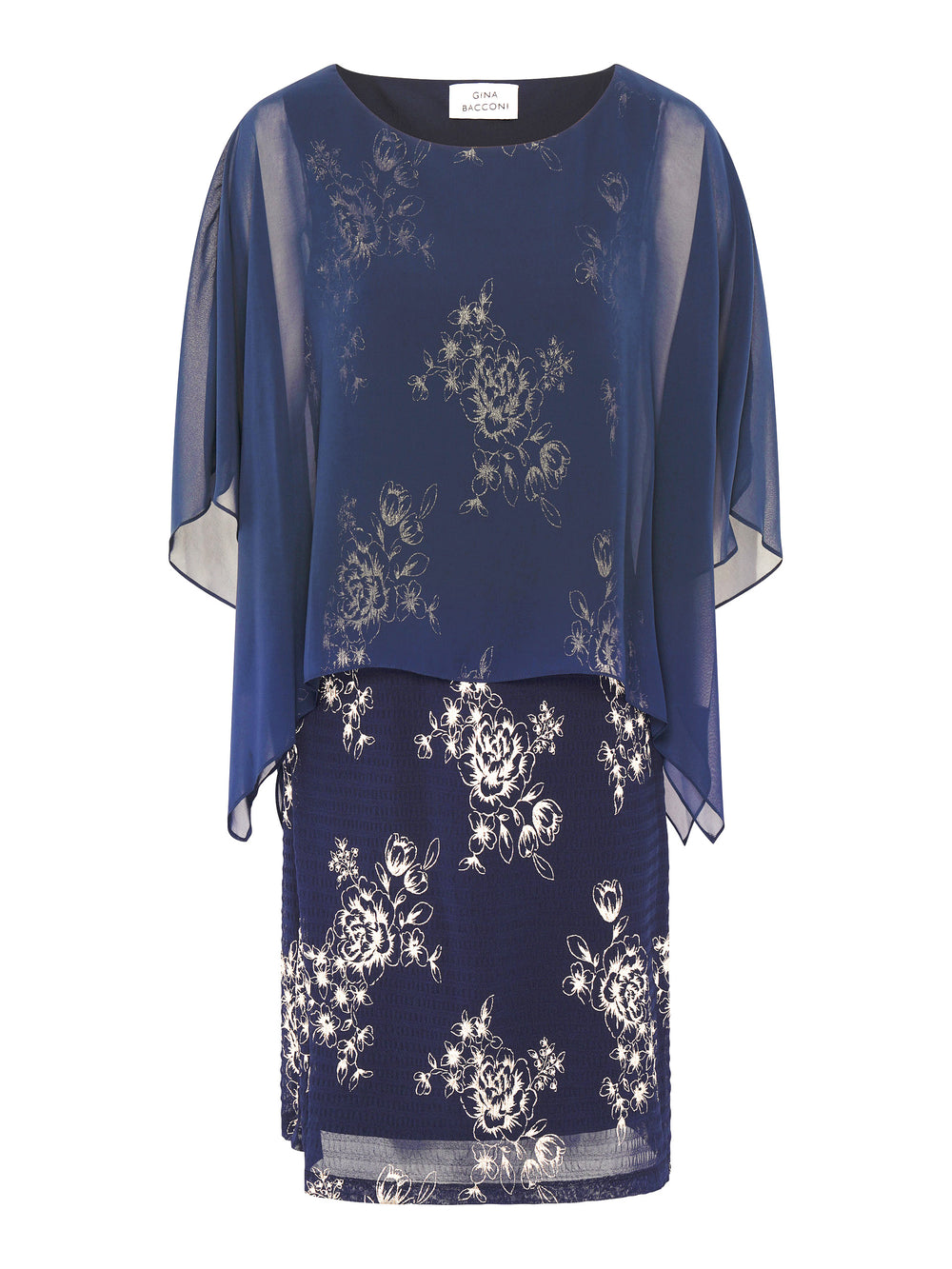 Elevate your occasionwear with our new Anne dress, a striking blend of comfort and elegance. This dress features a fitted navy dress with delicate gold foil floral print and is beautifully overlaid with a flowing chiffon cape. Perfect for weddings, evening events, or special dinners, this dress brings both glamour and ease.