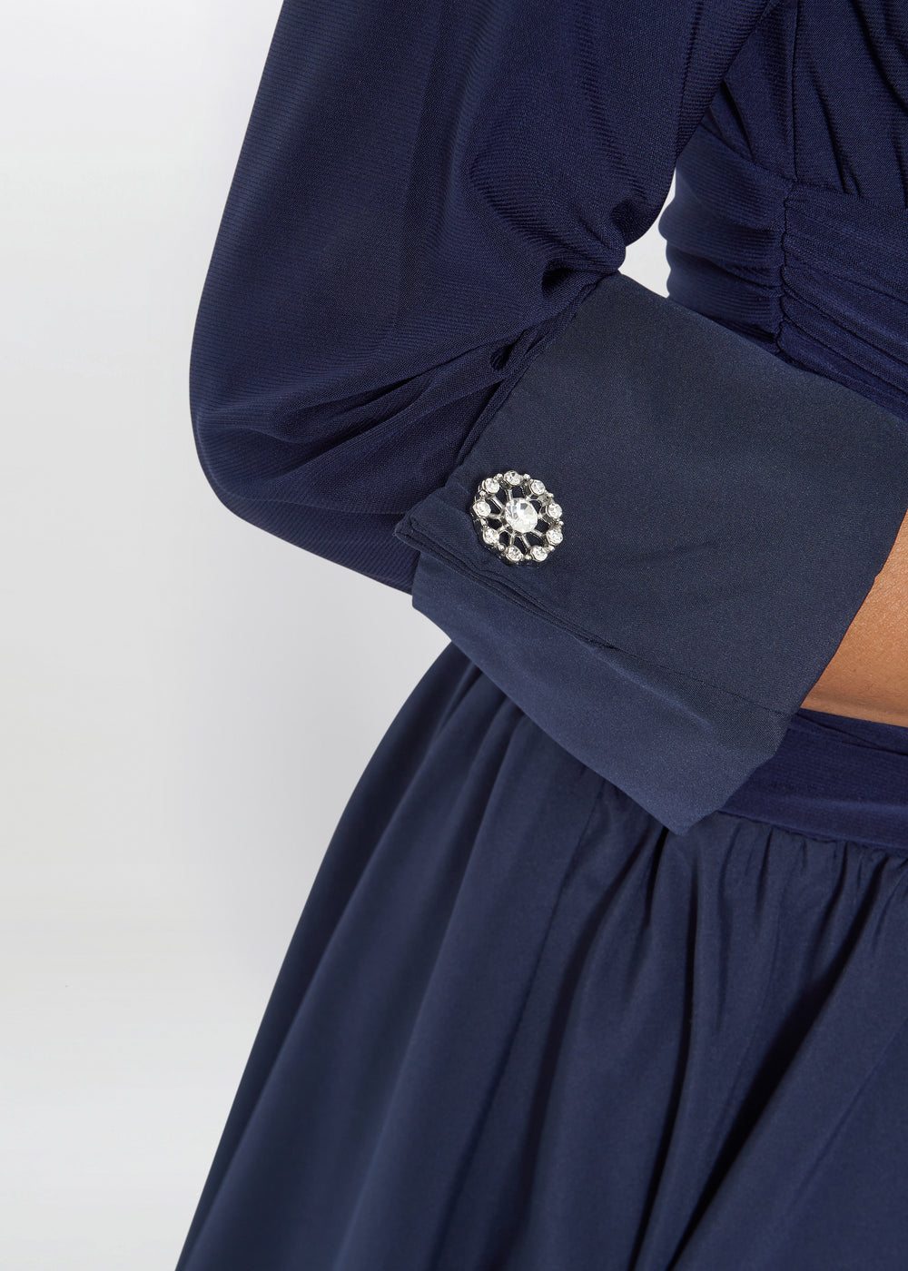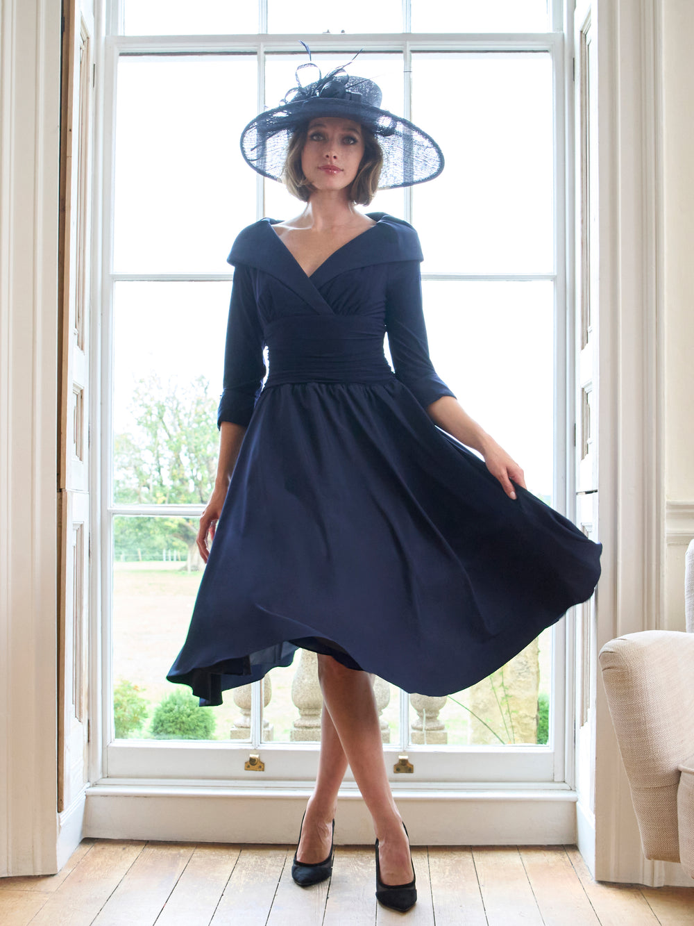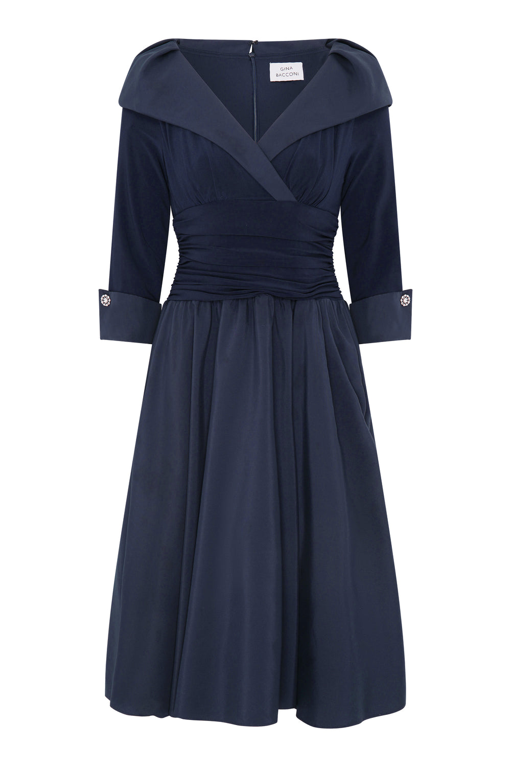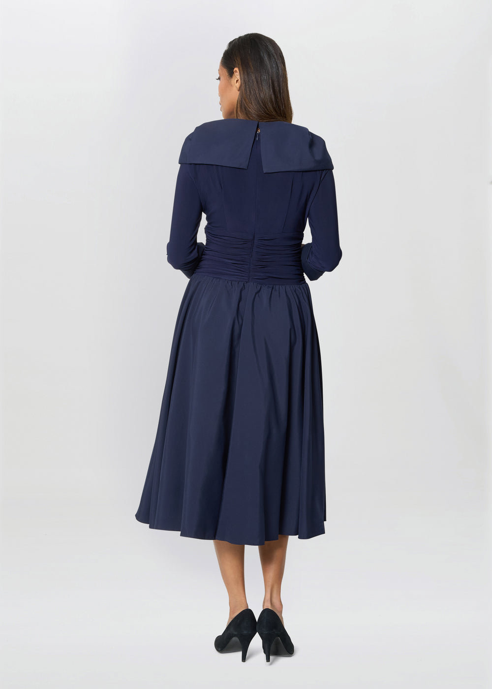 Elegant and timeless, the Anne-Marie dress is designed to make a refined statement at any special occasion. Made from a blue taffeta material, this dress features a sophisticated collar that frames the neckline. The bodice is ruched creating a flattering silhouette, while the cinched waist flows into a full skirt that moves effortlessly with every step. This dress provides comfort and style, perfect for weddings or formal events.