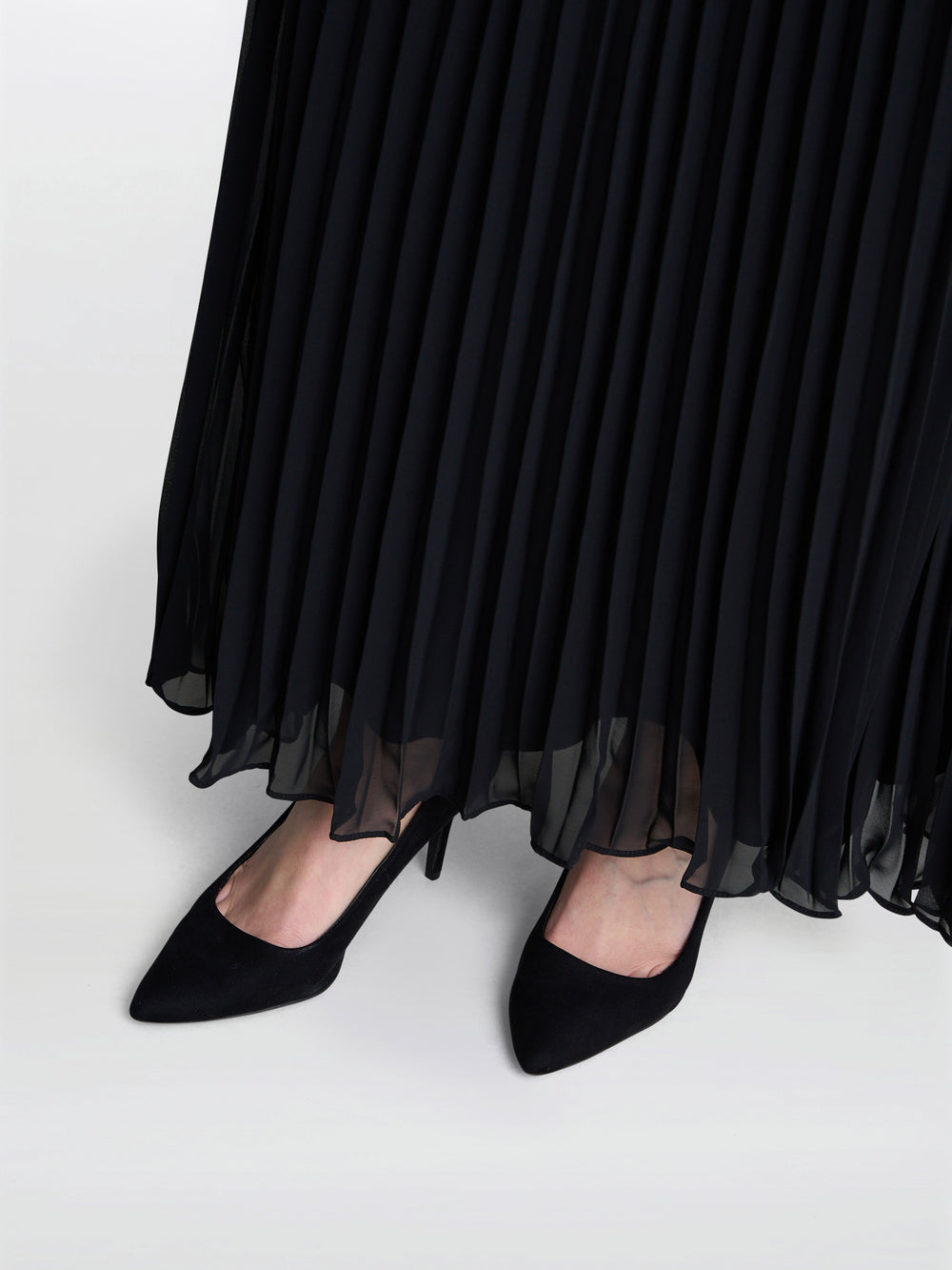 Designed with versatility in mind, the Annie skirt pairs effortlessly with everything from dressy blouses to casual knits. The comfortable elastic waistband ensures a flattering fit, while the sheer overlay and lined interior provide ease and modesty. Whether you're dressing it up or down, this pleated skirt offers classic sophistication with a modern edge.