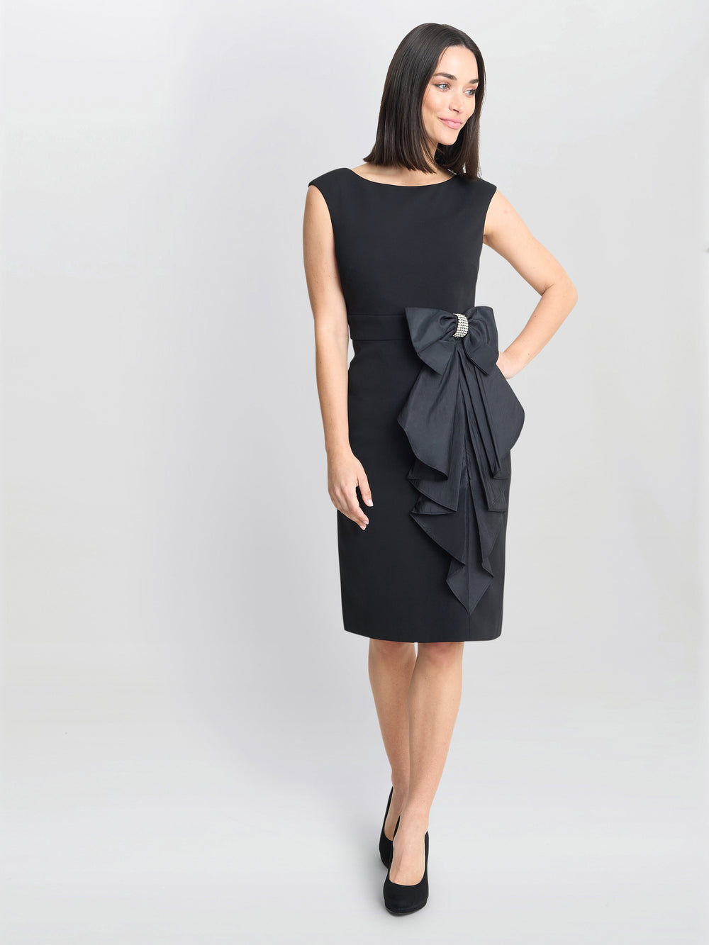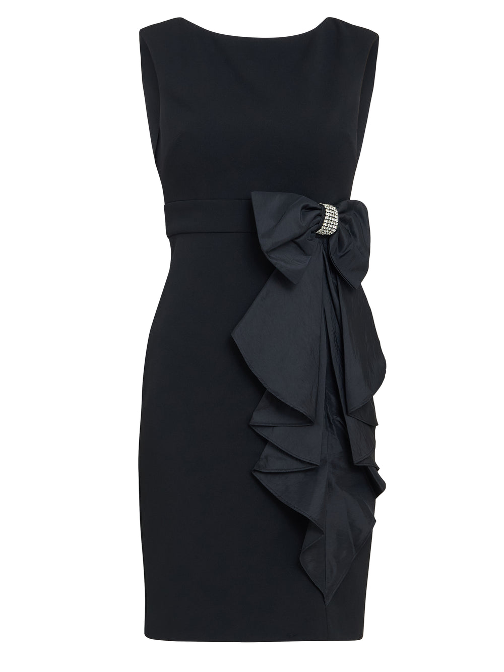 A great LBD with a standout taffeta bow! This simple, figure-flattering dress is crafted in a soft crepe fabric and a large taffeta bow. The bow is finished with a diamante center for added sparkle.