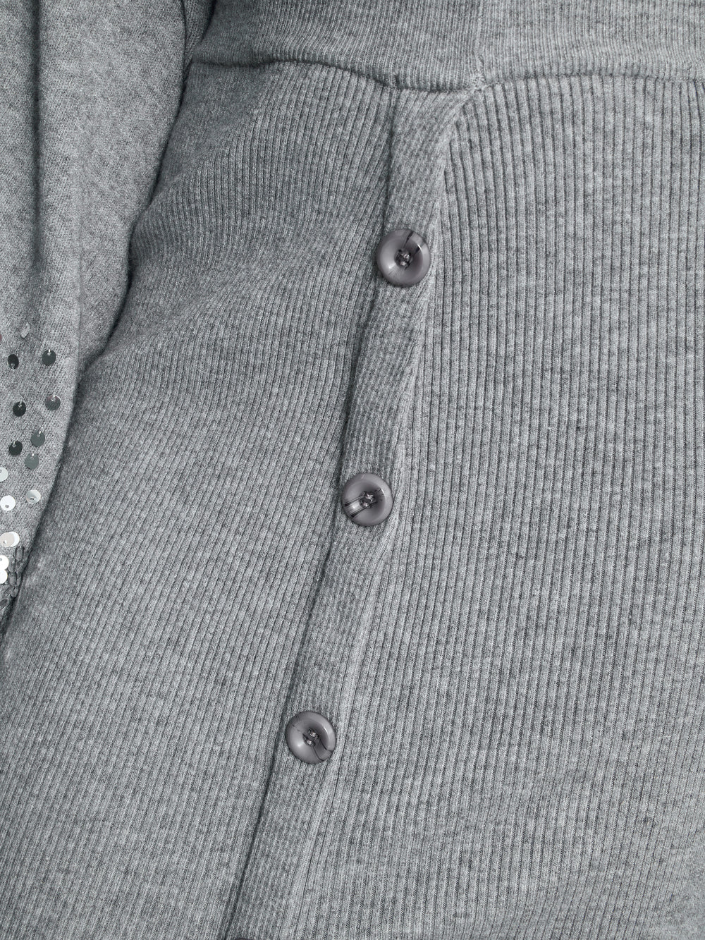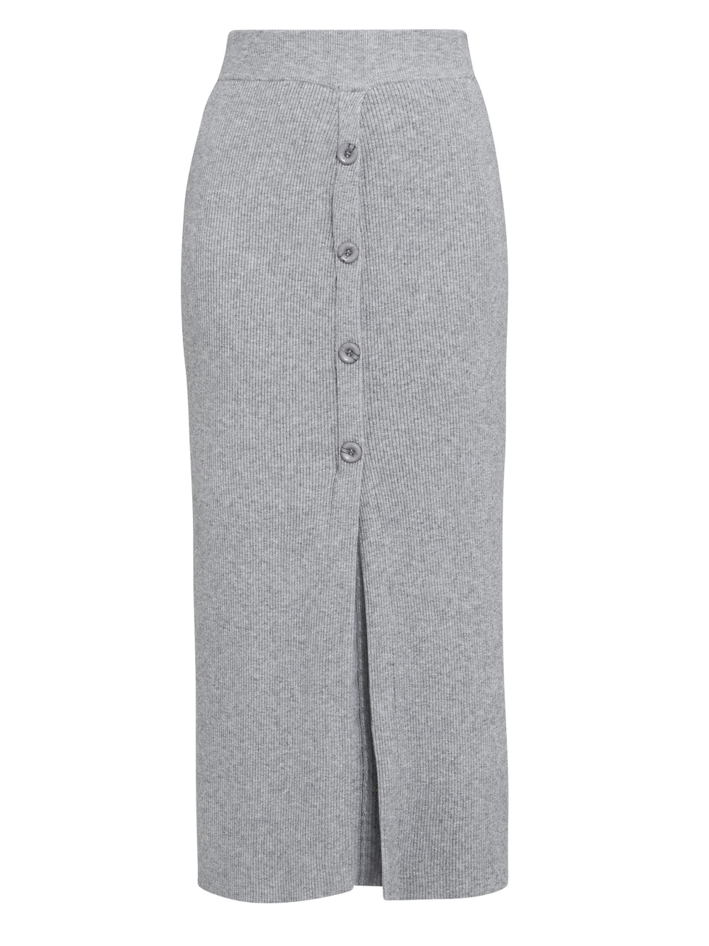 Chic, cozy and elegant. In a grey colour this knitted skirt is midi length that features button-down detailing and a sleek front slit that adds a touch of modern sophistication, perfect for both office settings and evening occasions.
