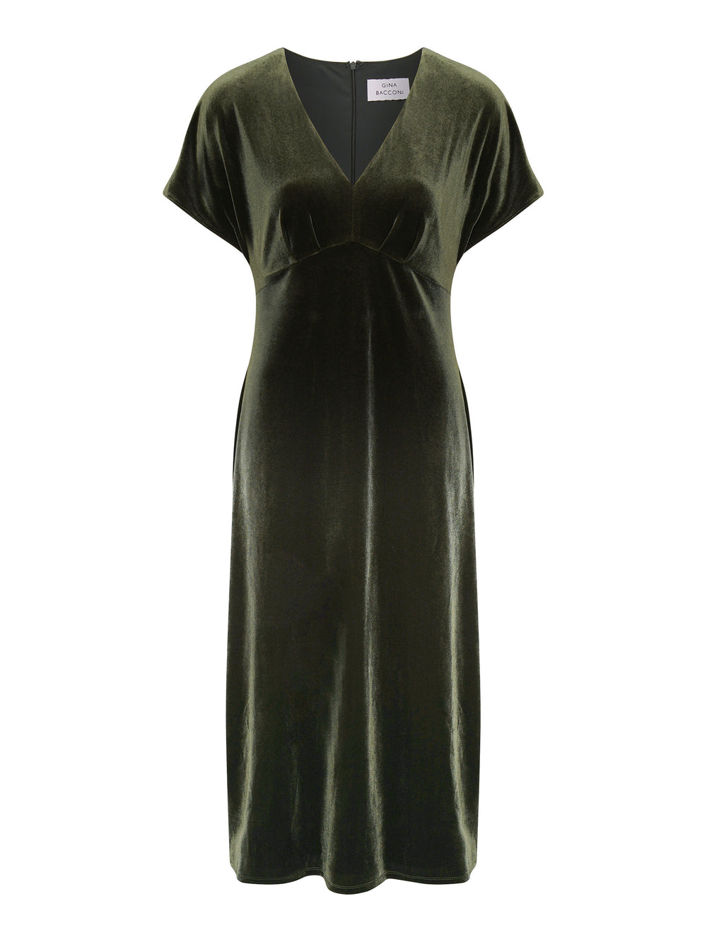 This dress is the perfect balance of effortless elegance and modern sophistication. Made from a soft velvet in an olive green colour, this midi dress features a flattering V-neckline and waist detail. The relaxed sleeves add a graceful touch, Perfect for winter weddings and evening occasions.