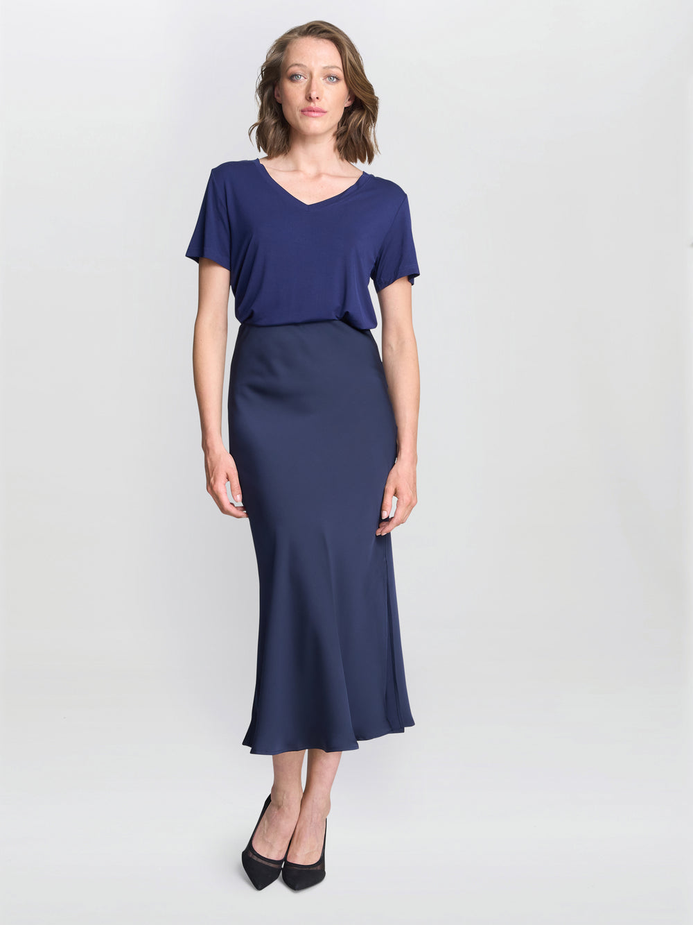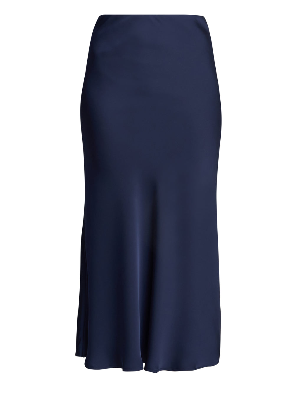 A simple satin bias cut skirt with side slit. This versatile navy skirt can be dressed up with heels for an evening look or down with a sweater and boots for the day.
