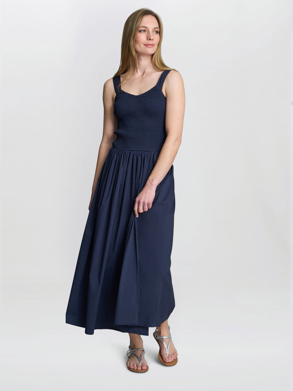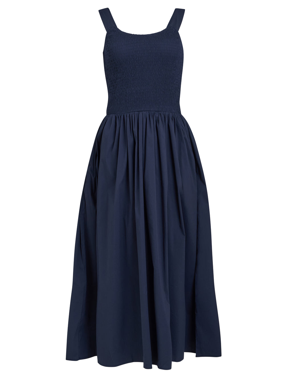 This dress is both elegant and comfortable! The navy blue color is timeless and sophisticated, while the shirred bodice adds a touch of texture and shape. The full skirt offers a flattering, flowy silhouette, and the pockets are such a practical yet stylish feature—perfect for keeping small essentials close. Being unlined gives it a light, breathable feel, making it great for warmer weather. A perfect mix of comfort and style, ideal for both casual and slightly dressier occasions!