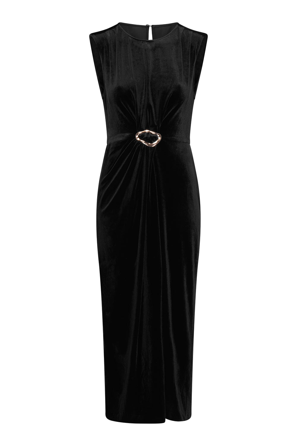 The Claudine dress is a sophisticated, velvet midi dress, made from black velvet. It features a sleeveless and classic round neckline. The standout detail is the gathered waistline, cinched with a gold-tone buckle that creates a flattering silhouette. This dress offers effortless glamour, perfect for evening events or any special occasion.