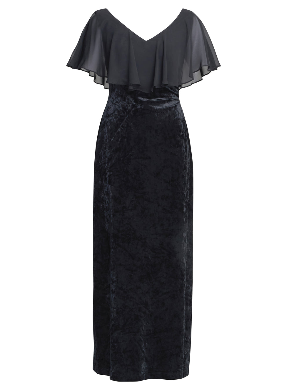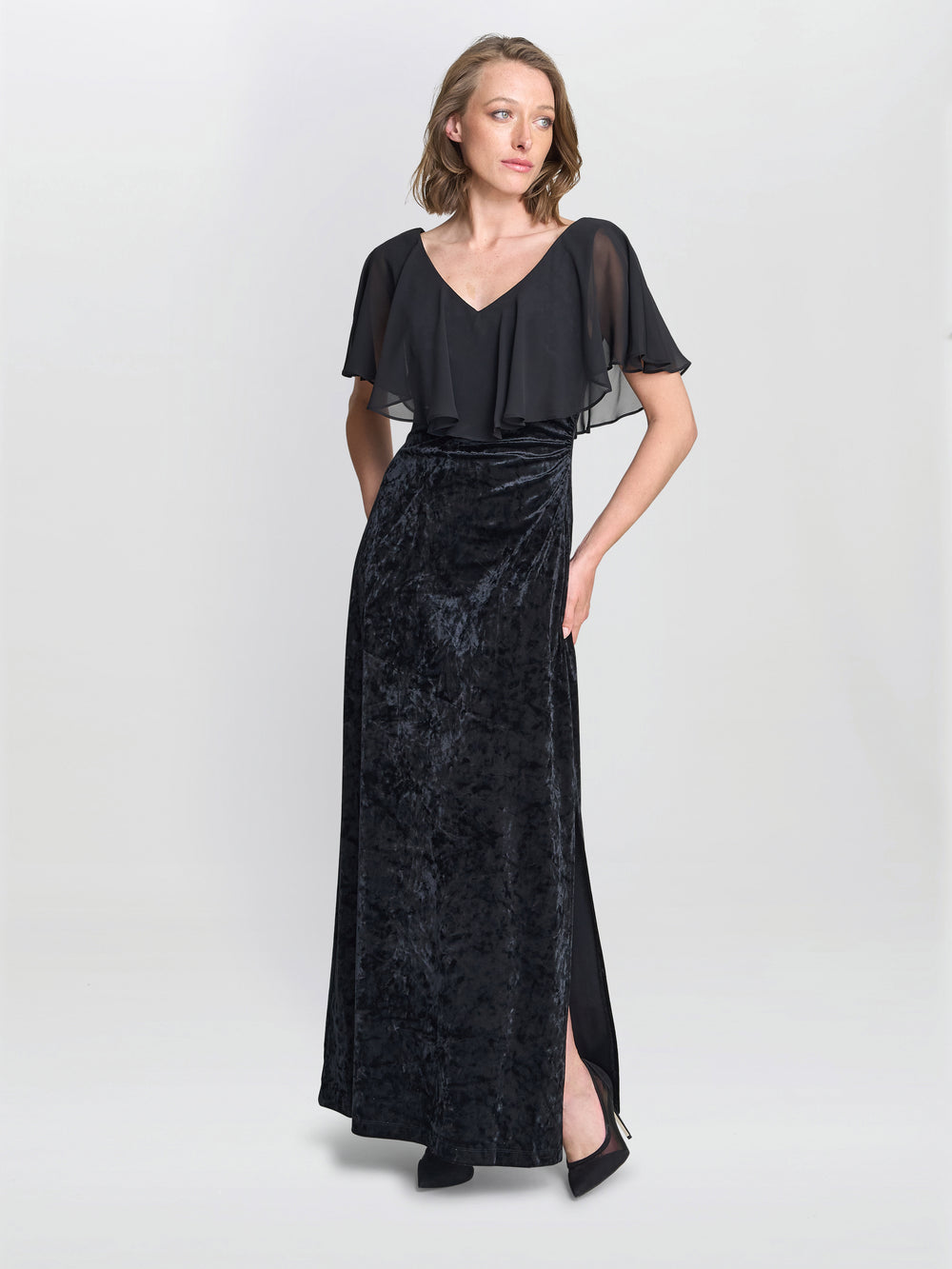 The Daphne velvet maxi dress is a timeless evening piece. Designed with a soft, black luxurious velvet skirt that flows to the floor, it creates a sleek and sophisticated silhouette. The dress is beautifully finished with a chiffon cape overlay, offering delicate coverage. Featuring a flattering V-neckline and a chic style, this piece is perfect for formal occasions. Measuring 154cm.