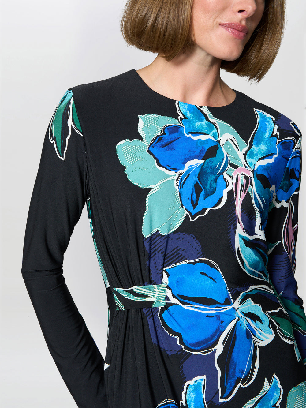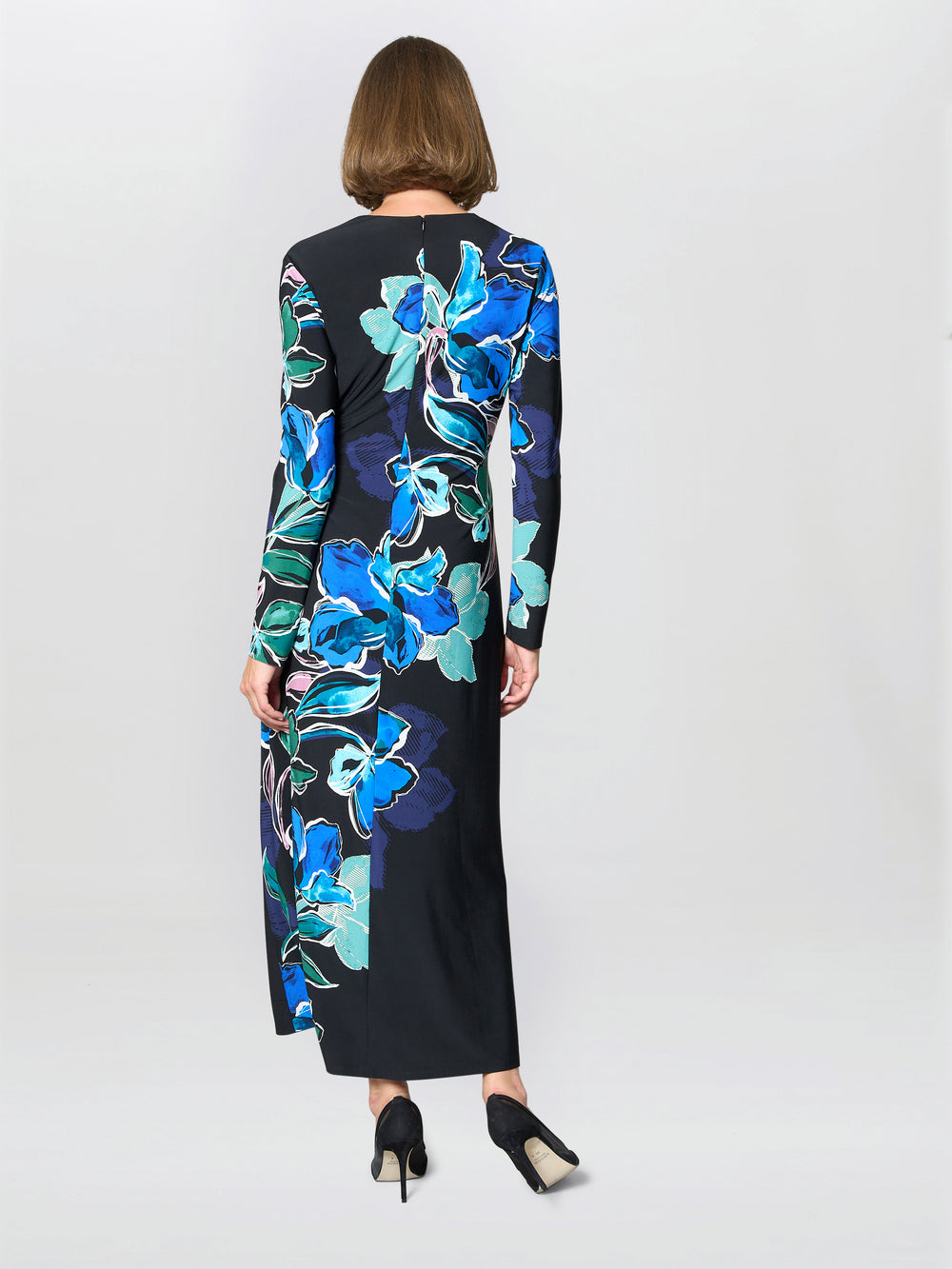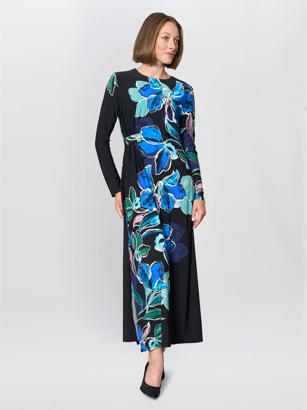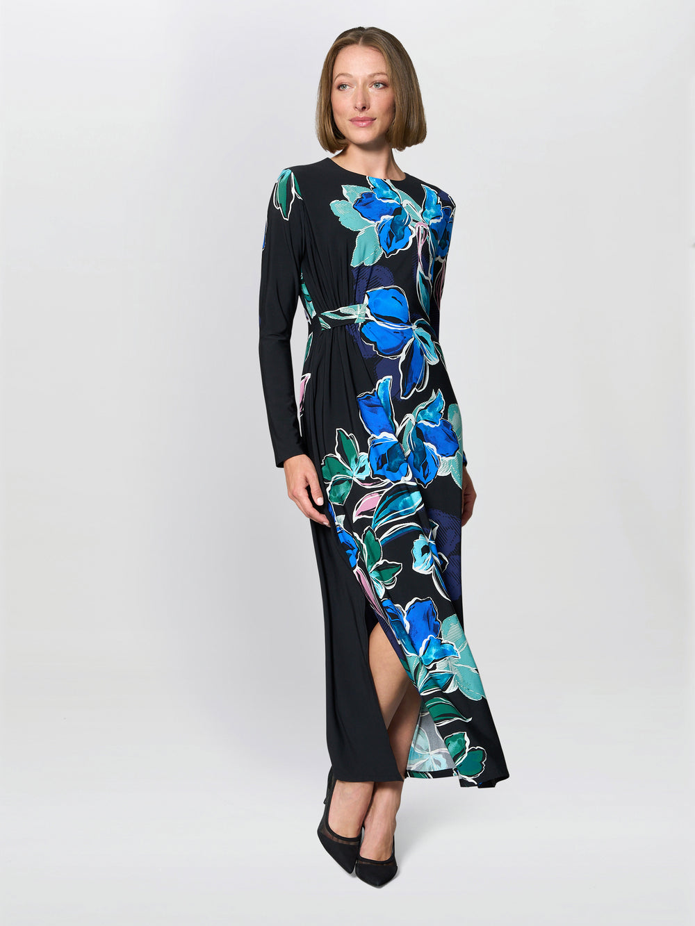 This elegant Eli dress features a striking floral print in shades of blue and green on a black base. Designed with a sleek silhouette, the dress has a slit on the side that adds a touch of sophistication. The long sleeves and flowing fabric create a flattering, polished look perfect for parties and evening events. Measuring 133cm and lined.