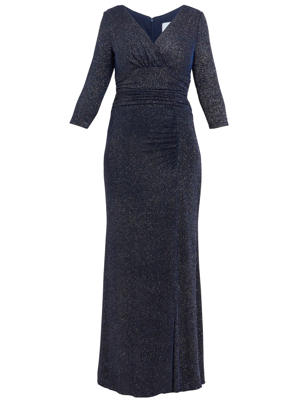 Our Eugenie maxi dress is crafted from a soft knit metallic flecked jersey. This dress features a gathered waist for a figure flattering look. It has a elegant side slit to knee height.