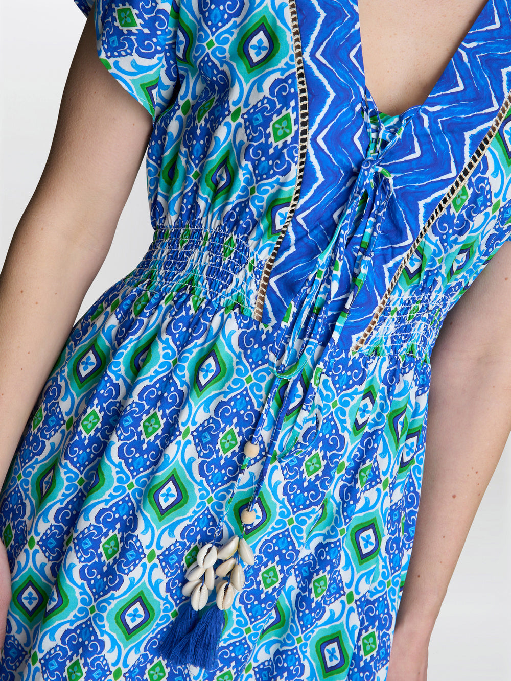 A breezy and elegant short summer dress in a beautiful blue and green print. Designed with a shirred elastic waist for a comfortable and flattering fit, it features a non-functional waist tie, adorned with seashells, delicate crochet trims, and button-down detail to the waist. Lightweight and unlined, this dress is perfect for warm, sunny days.