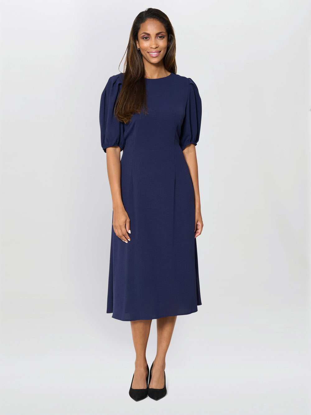 Simple elegance meets modern sophistication. Designed in a rich blue colour, this dress features a clean, tailored silhouette that flatters with ease. The standout detail is the puff sleeves, adding a romantic and fashionable touch. Made from a soft, structured fabric, the midi length makes it ideal for work, weddings or cocktail gatherings.