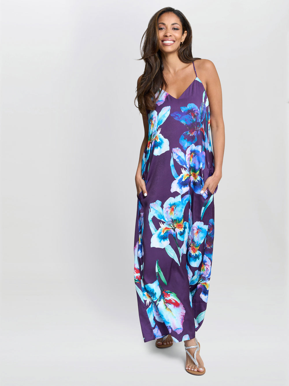 Bring a burst of colour to your wardrobe with the stunning Genny dress. Designed with a vibrant floral print on a rich purple background, this maxi dress exudes effortless elegance. Made from a lightweight fabric, it features delicate straps and a flattering V neckline for a graceful silhouette. Perfect for summer events, weddings and holidays.