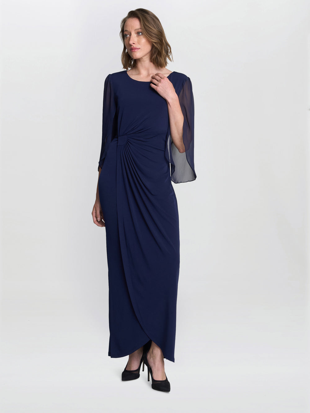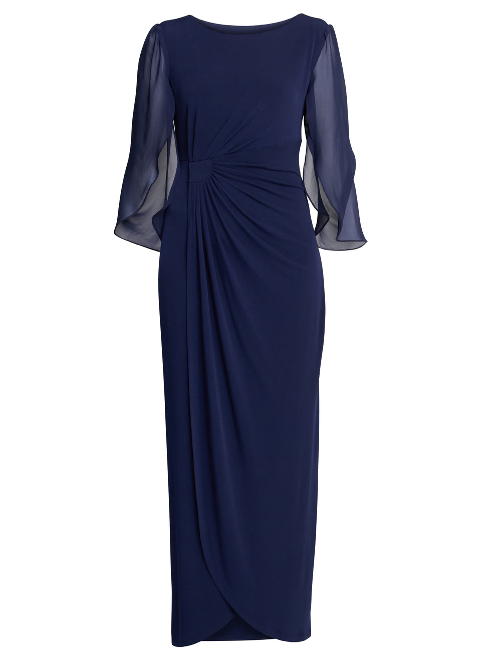 Our fabulous new navy blue jersey maxi faux wrap dress features a three-quarter length chiffon tulip sleeve. This slip-on style dress is designed to be easy to wear again and again. The faux wrap silhouette enhances curves to create a feminine look. This dress is half lined and measures 145cm from the high shoulder point to the hem.