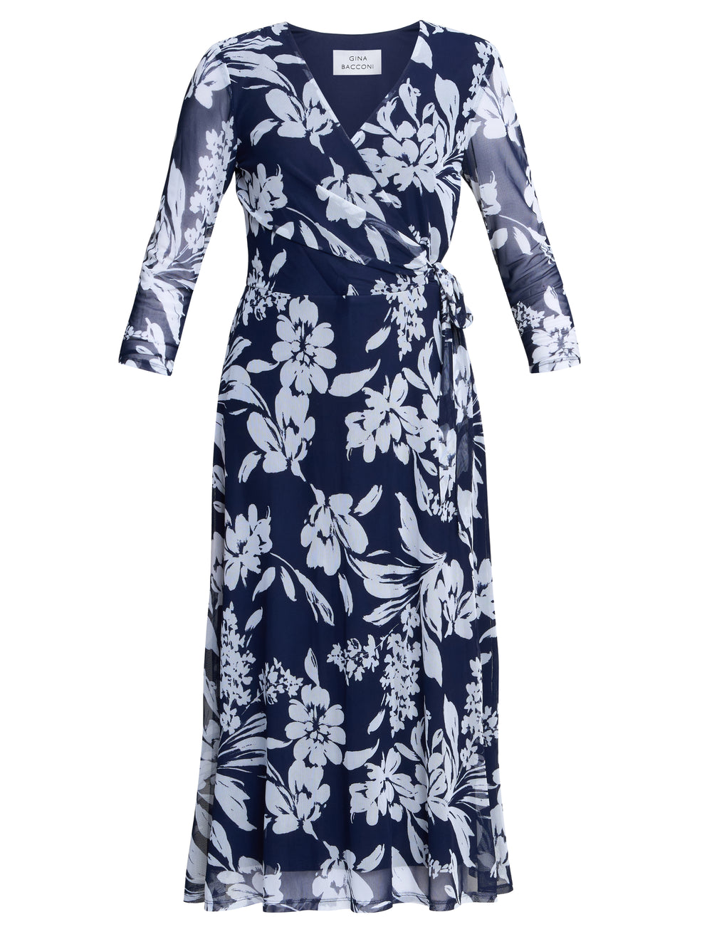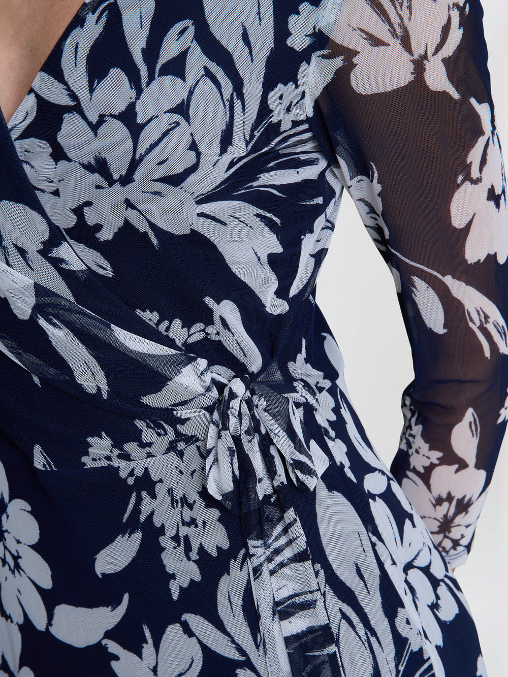 Feminine and flattering, this dress is a timeless piece perfect for weddings, garden parties, and daytime outings. Made from a lightweight chiffon, this elegant dress features a cream floral print set on a classic blue background. The wrap bodice creates a flattering V-neckline, while the sheer 3/4 sleeves add graceful coverage. This dress is lined with sleeves unlined.