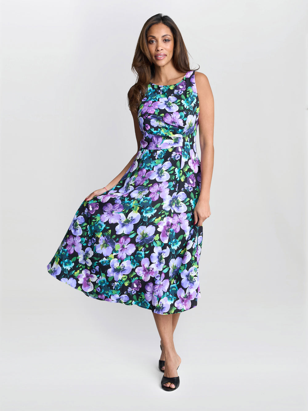 Easy wearing, lightweight and vibrant. The Jesselle floral dress is a sleeveless midi dress in a gorgeous floral print in shades of purple and green. The flattering A-line silhouette and soft pleating create graceful movement and a comfortable, elegant fit that suits any day or evening event. Measuring 118cm.
