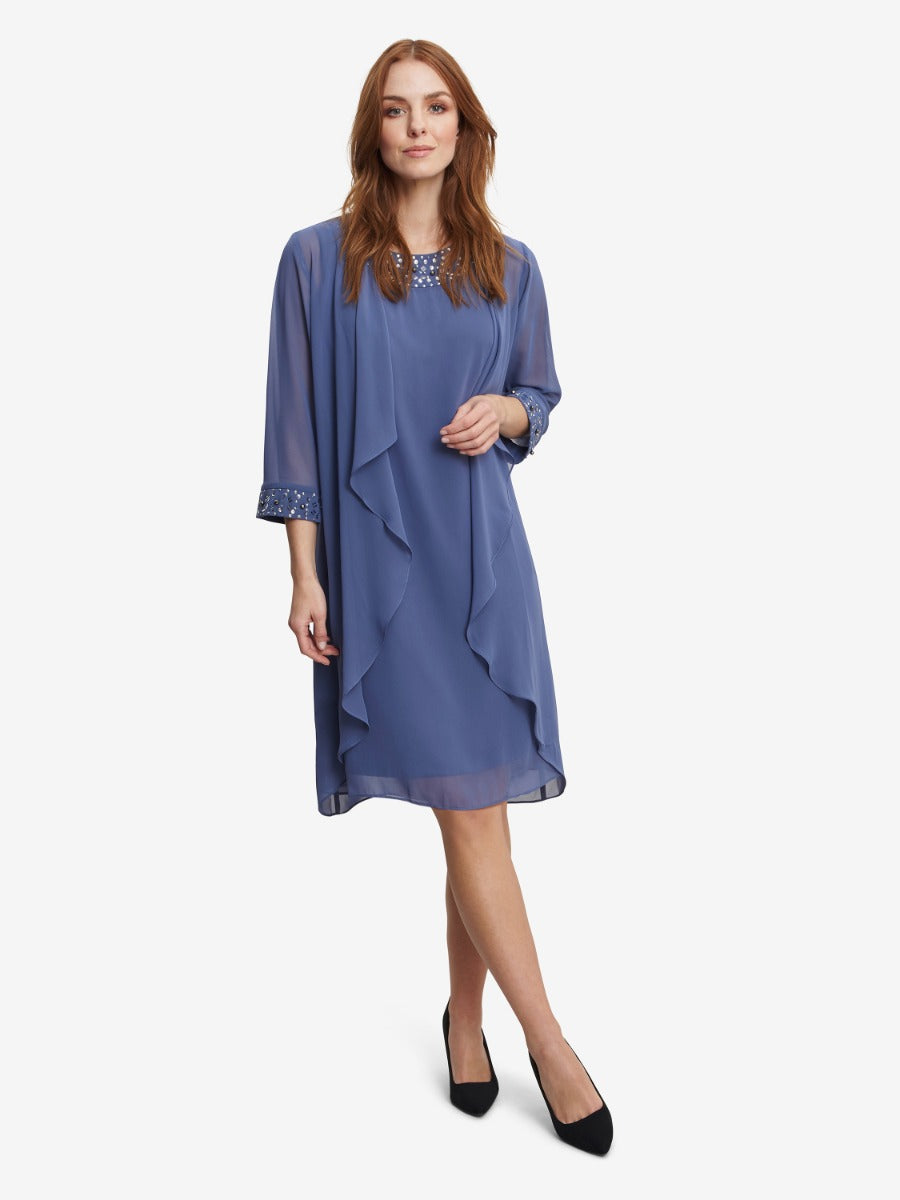 Our elegant Gina Bacconi open-front jacket lends soft texture to this short chiffon dress, while beading at the neckline adds a hint of shine. The perfect ensemble.