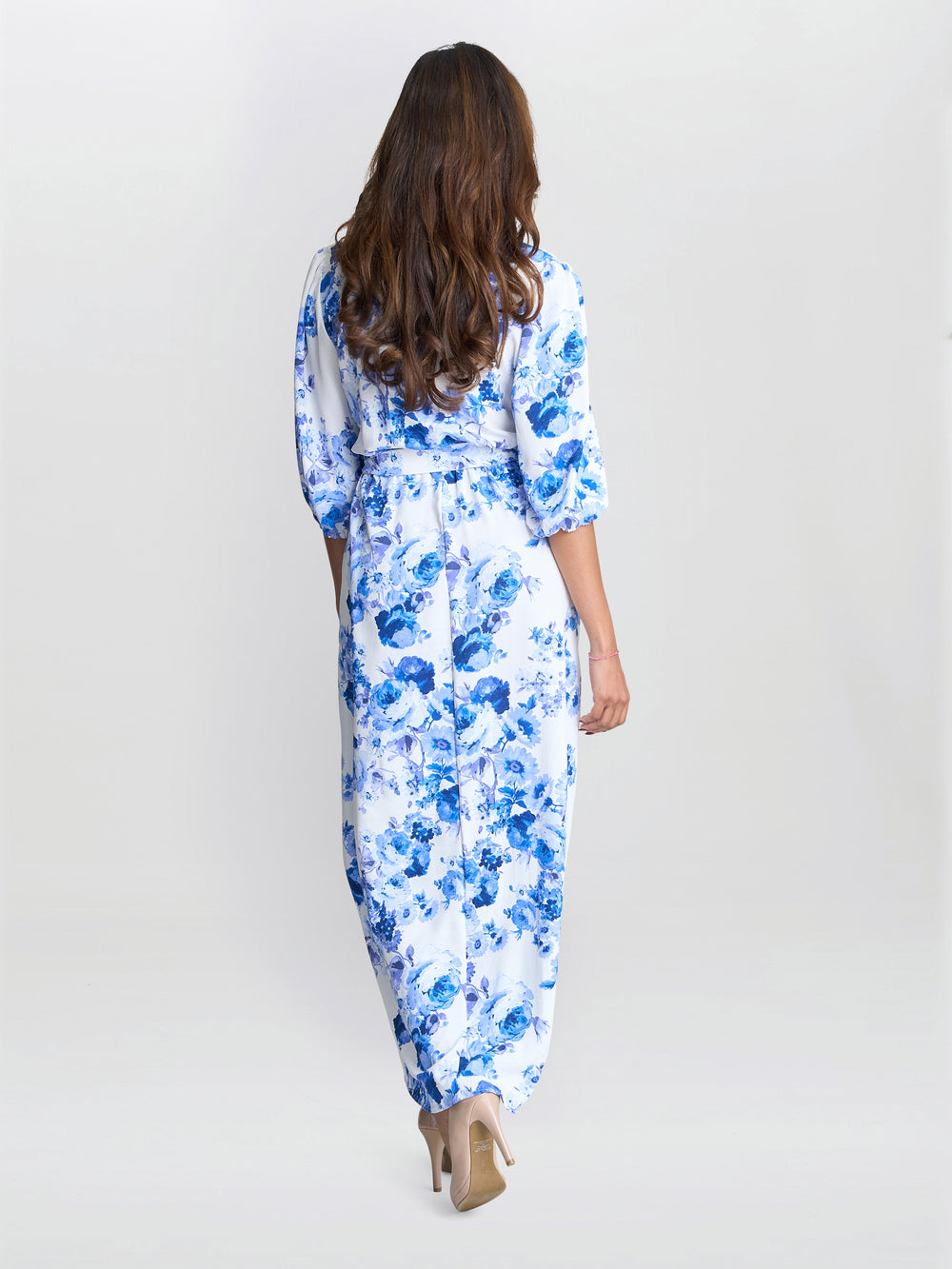 Make an effortless statement in the Karen floral maxi dress. This stunning piece features a soft white base with delicate blue floral blooms, creating a fresh and summer feel. The dress has a flattering wrap style bodice with a V-neckline and beautiful elbow-length puff sleeves and a self tie belt that cinches the waist for a flattering silhouette. Measuring 137cm and unlined.