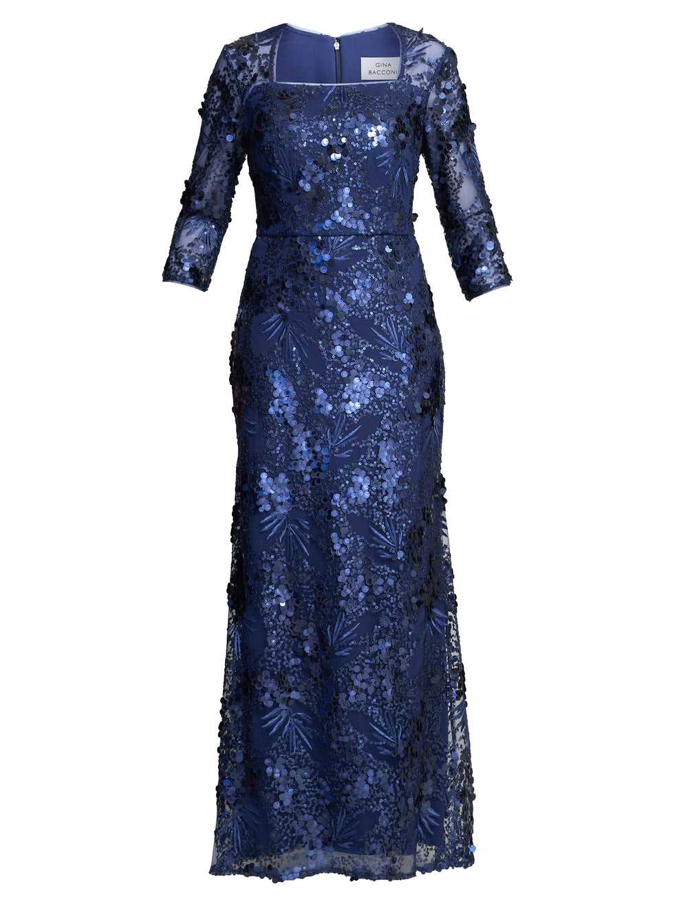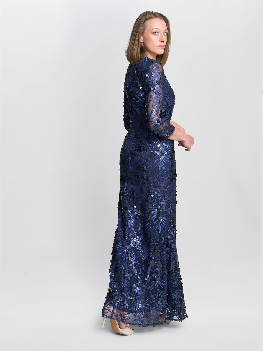 Dazzle with elegance in our Kristy maxi dress, a show-stopping piece designed to turn heads at any formal occasion. Designed in a deep blue, this maxi dress features an overlay of shimmering sequins in a floral lace pattern, the flattering square neckline adds a touch of vintage charm, while the sheer 3/4 sleeves provide graceful coverage. The dress is lined with sleeves unlined.