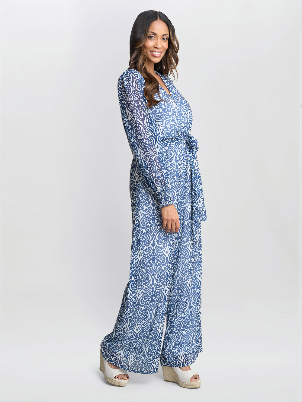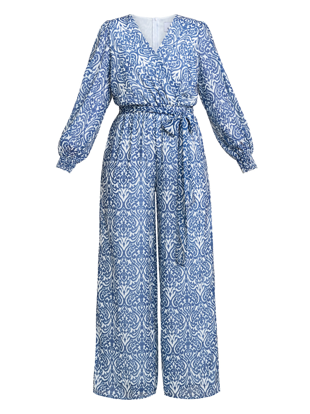 Throw on this easy wearing blue and white, floral, chiffon jumpsuit for all occasions! With a wrap effect body and elastic cuff sleeves, this jumpsuit is versatile and stylish. Wear with heels or trainers, the look is yours to define.
