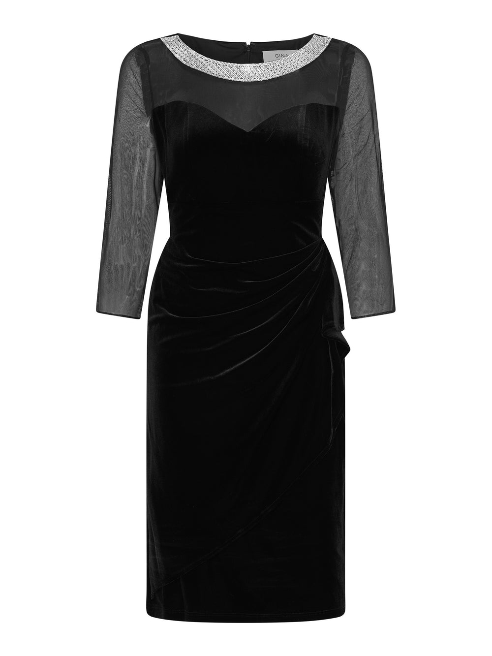 Classic elegance meets modern glamour in the Lana velvet dress. This sophisticated black dress features a flattering bodice with sheer mesh and finished with a dazzling embellished neckline for a touch of sparkle. Made in a velvet, the dress is designed with a soft gathered waist and 3/4 sheer sleeves.