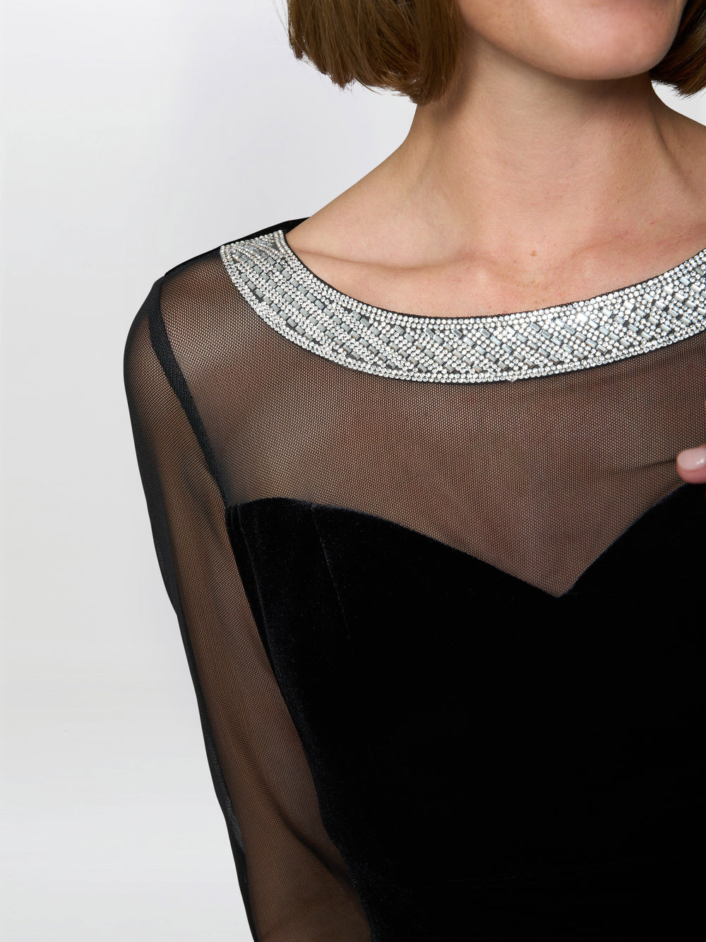 Lana velvet dress with sheer sleeves and neckline