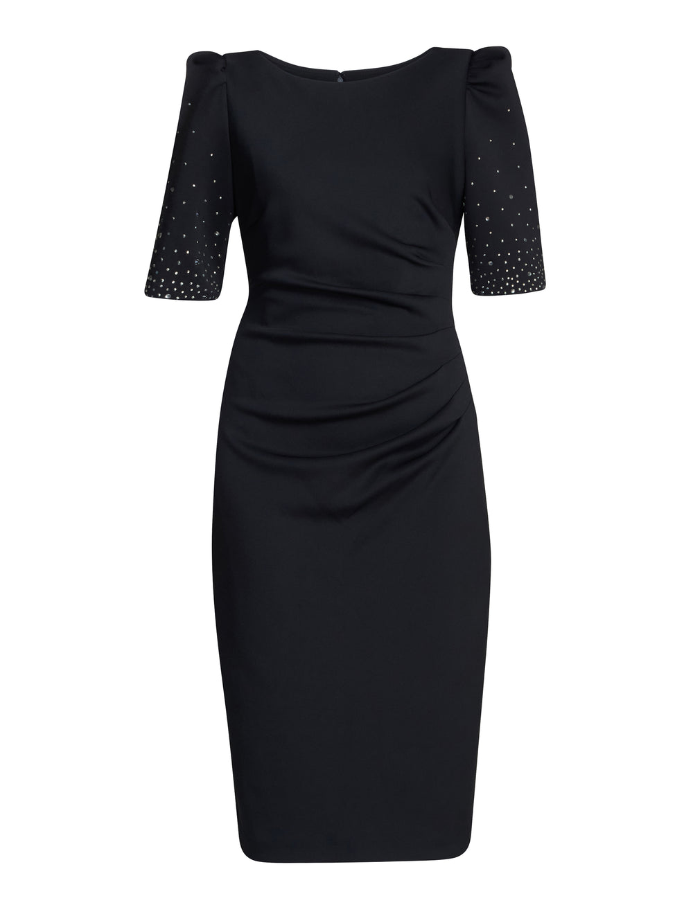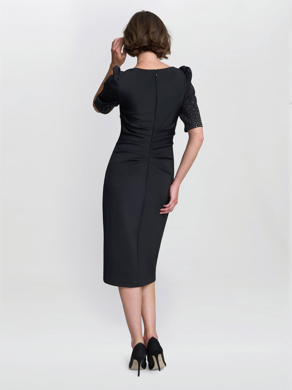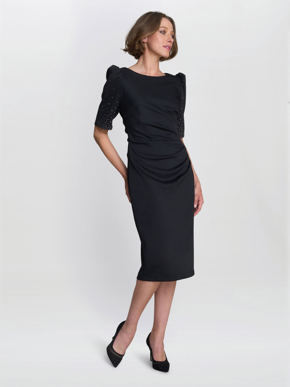 Elevate your wardrobe with the timeless sophistication of the Louisa dress with beaded sleeves. This elegant midi dress is made in a rich black fabric and designed to flatter with its gently draped waist. The gorgeous half sleeves with delicate beadwork add a refined touch of sparkle that catches the light beautifully. This dress brings contemporary elegance to any occasion.
