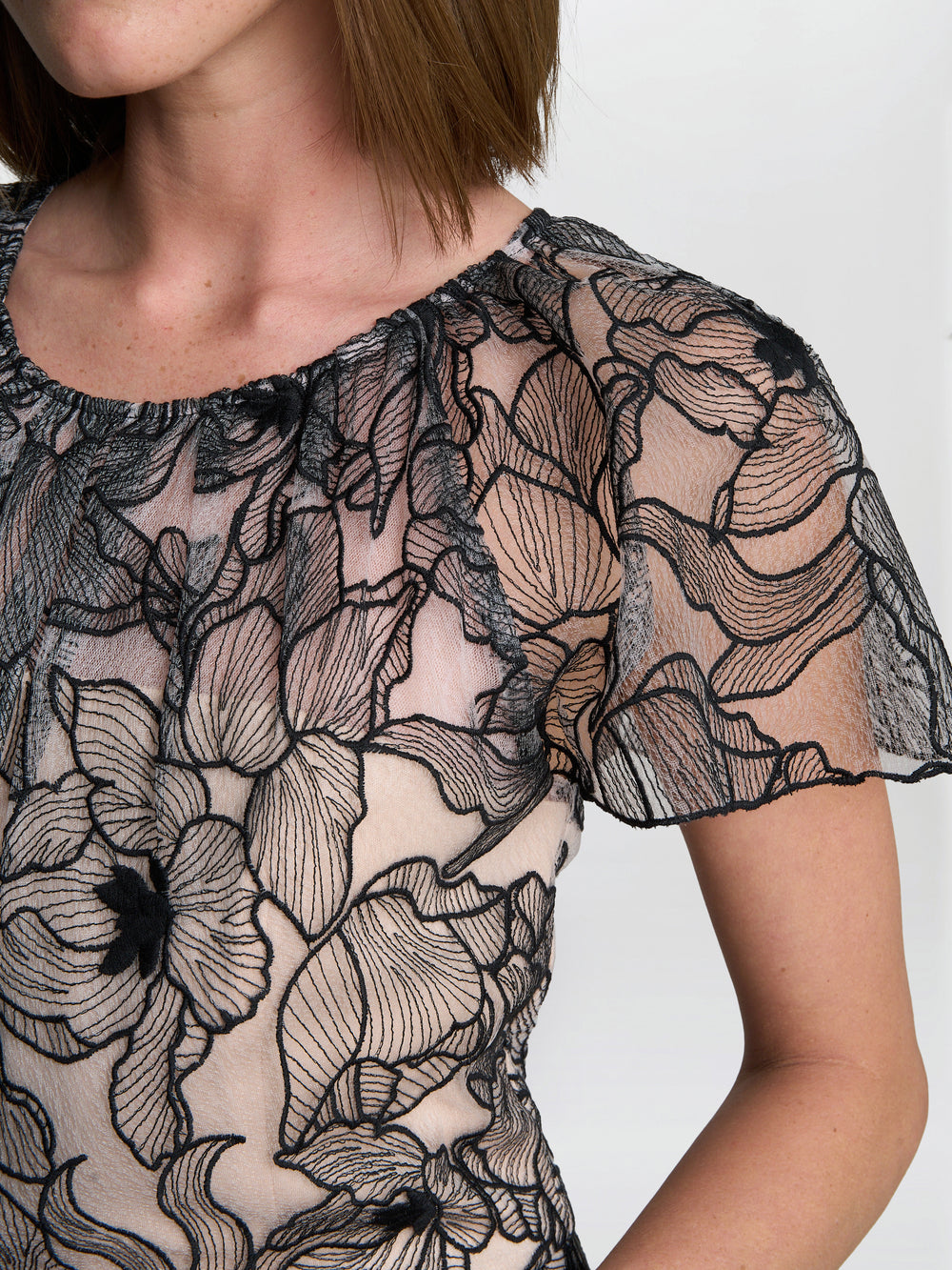 Make a graceful entrance in this gorgeous embroidered maxi dress, a sophisticated piece that captures timeless elegance with a modern twist. Featuring a soft nude overlay adorned with black floral embroidery. This dress is complemented by flutter sleeves and a delicate round neckline, making it ideal for weddings, galas, or any special occasion.