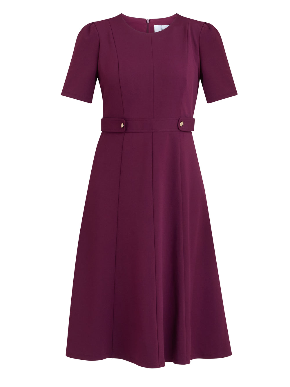 Classic charm meets modern elegance. In a rich plum colour, this flattering silhouette features short sleeves, a round neckline, and tailored seam for a sleek and structured fit. A softly flared skirt provides graceful movement, while the built in belt with buttons cinches the waist. The Mel dress is a polished choice for the office, formal events or any special occasion.