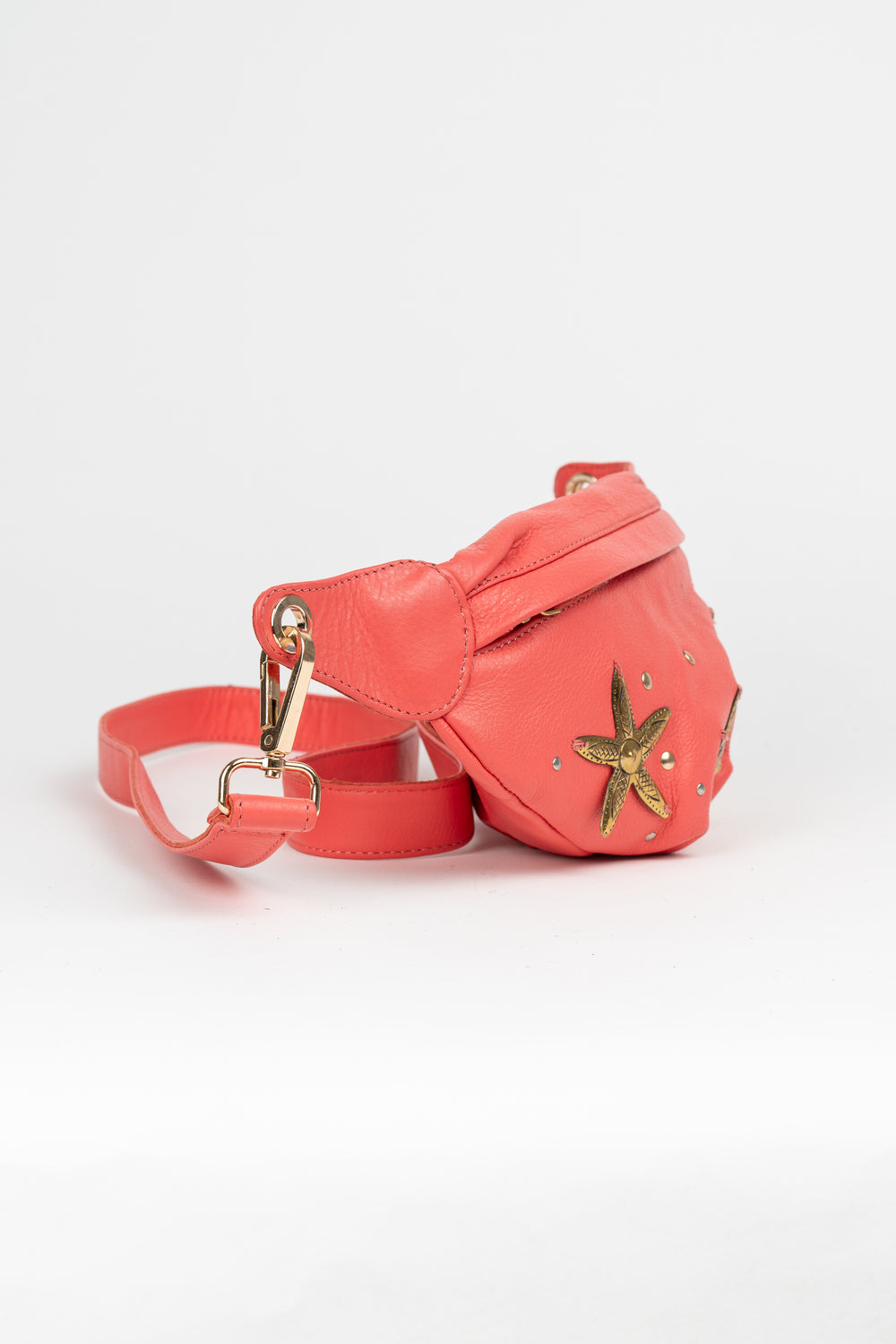 This red shoulder bag stands out for its originality, adorned with metallic starfish decoration that gives it a fresh and beachy air. Its compact and functional design allows you to carry your essentials comfortably and safely. Made of 100% leather, this fanny pack is ideal for those looking for a versatile accessory for everyday wear.