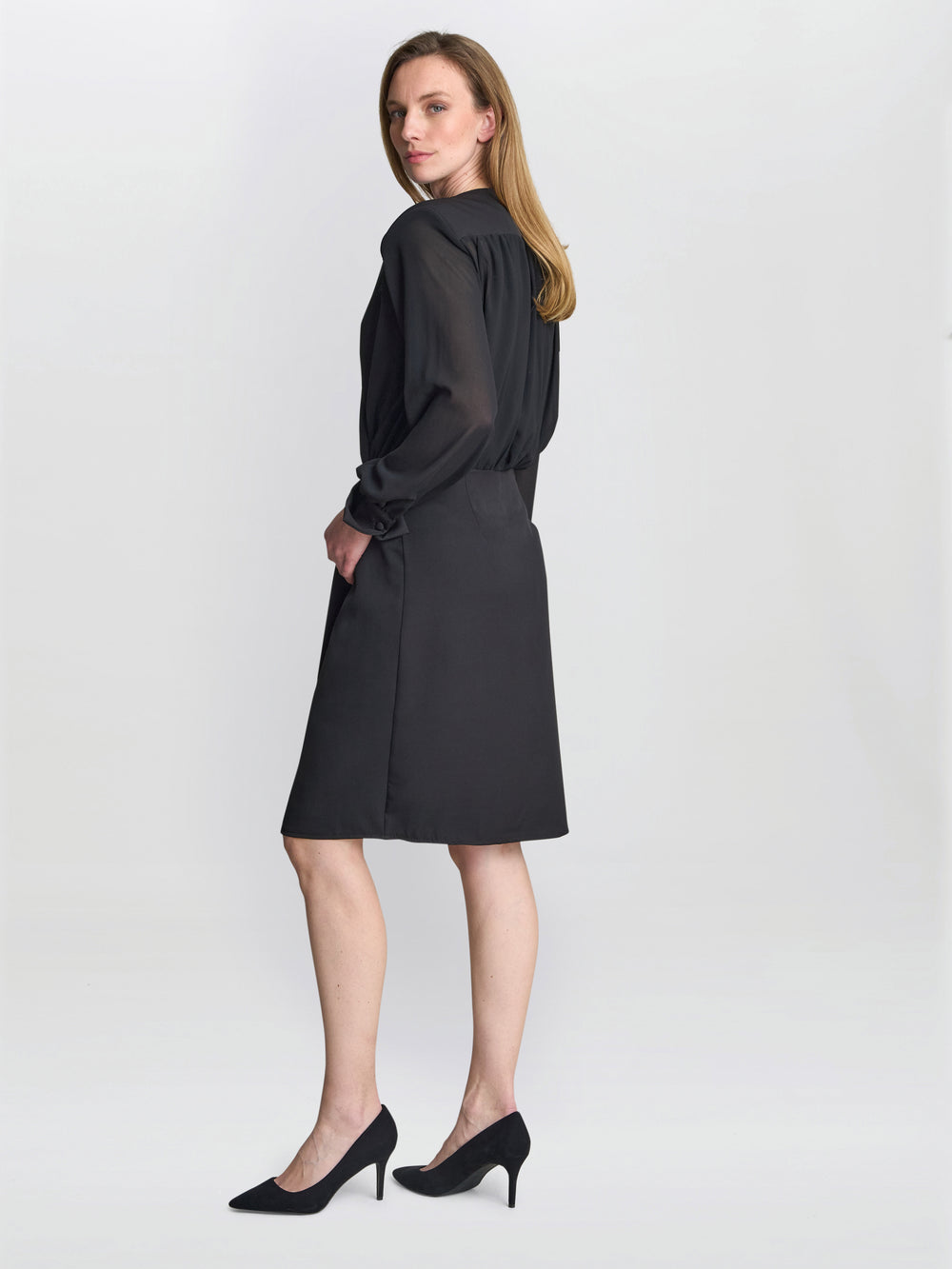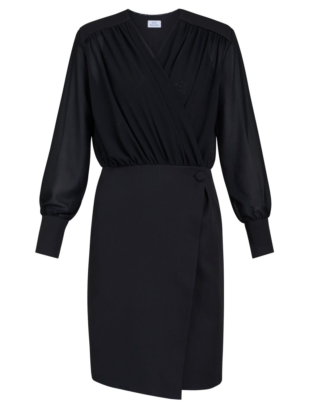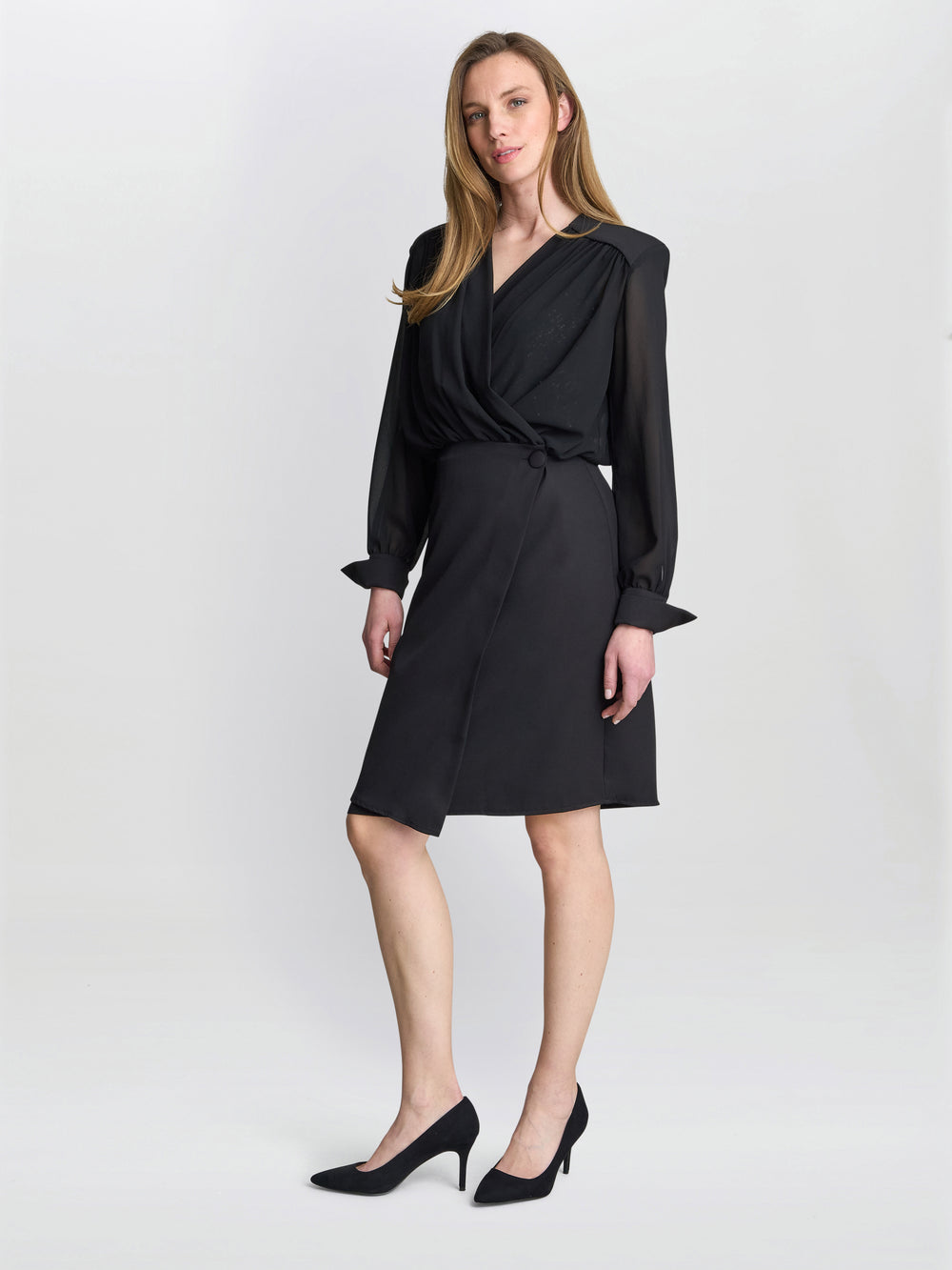 Elevate your wardrobe with timeless sophistication. This elegant black two-piece dress features a wrap-style chiffon top with sheer long sleeves. The matching skirt is modern and knee length, with a side button at the waist that cinches effortlessly, enhancing the figure while offering a perfect fit. Perfect for evening events, formal gatherings, or work.