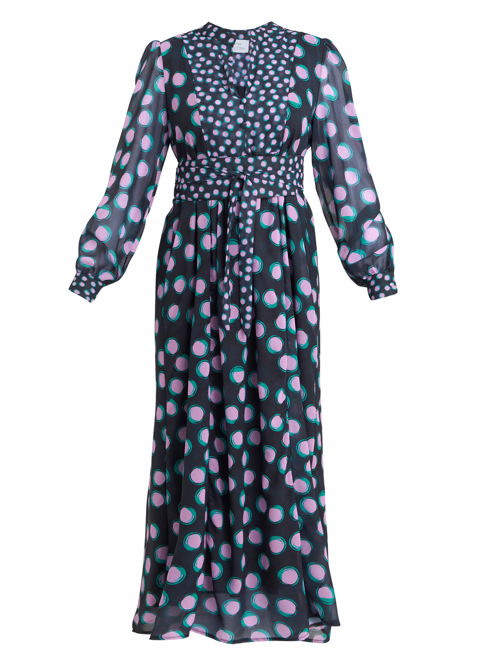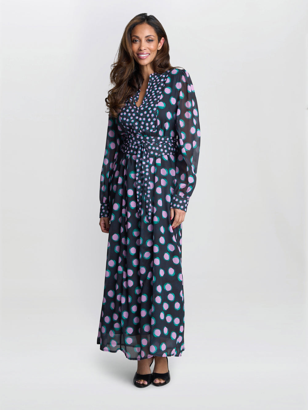 Effortlessly elegant with a touch of charm, the Renata dress is your go to for timeless sophistication. Featuring a soft polka dot print in shades of pink and green on a black base. The full-length sheer sleeves and skirt add graceful movement, while the soft inner lining ensures comfort throughout the day. Perfect for garden parties or any special occasion.