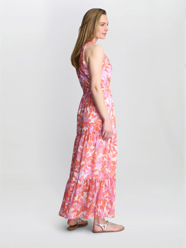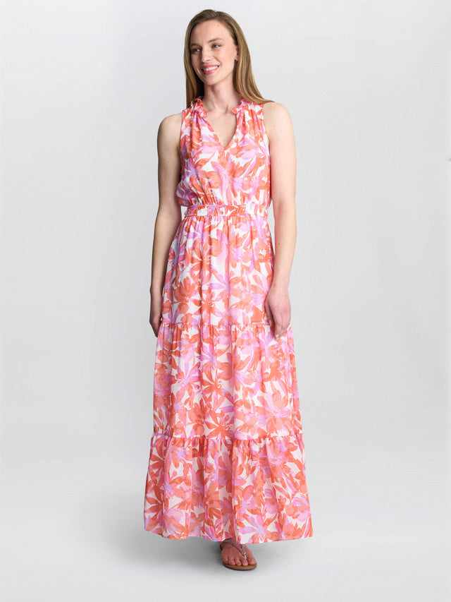 Feel chic in the Roweena floral maxi dress, a perfect piece for sunny days. This sleeveless dress features a flattering V neckline and a beautifully gathered elastic waist that enhances your silhouette with comfort and ease. The standout orange floral print brings a fresh and playful energy to your look.