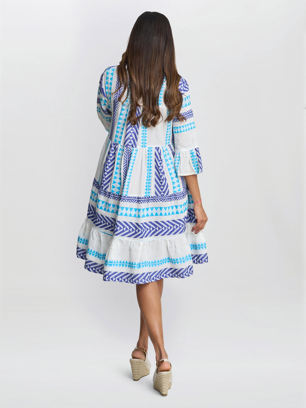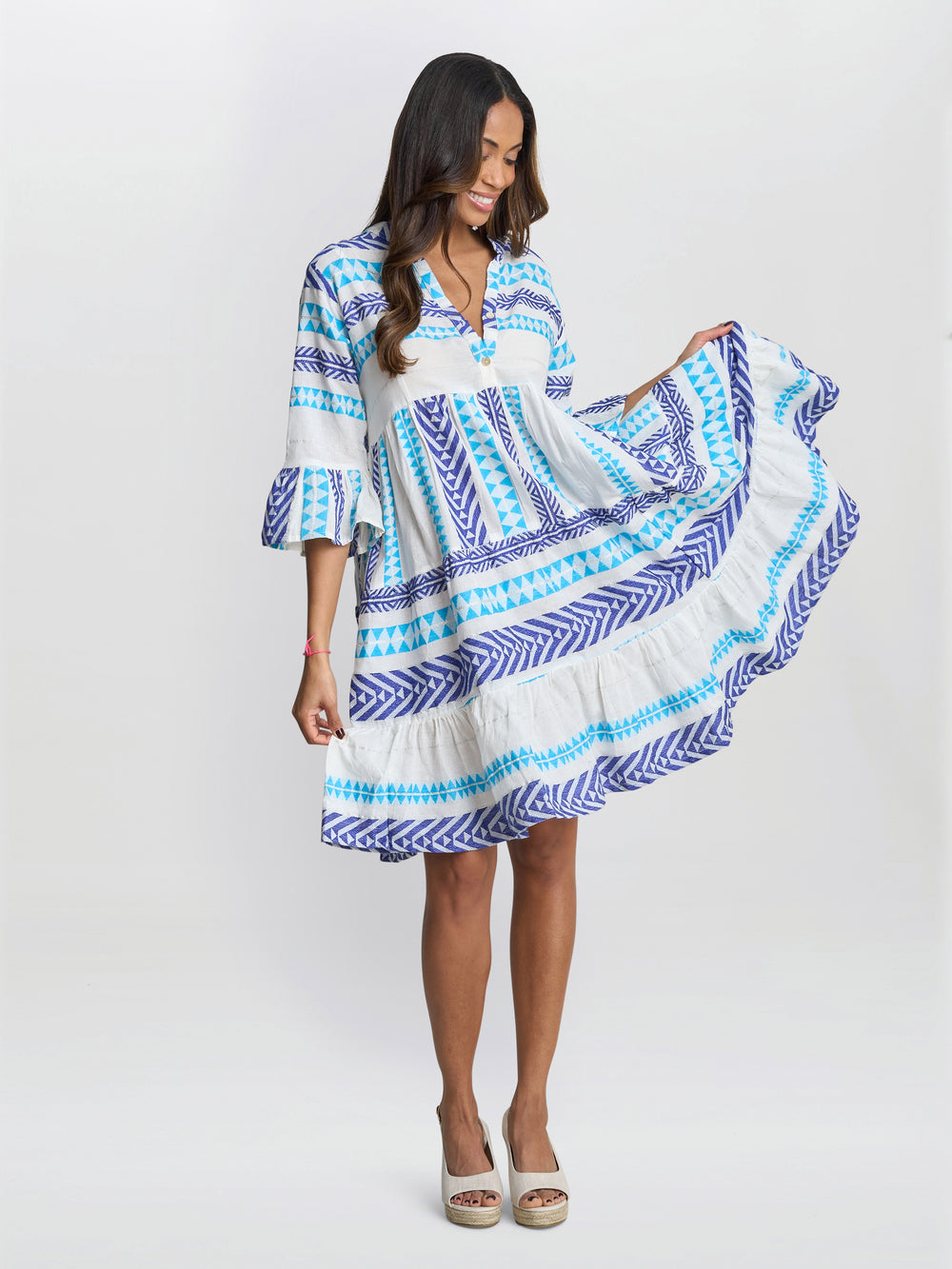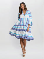 This Rubina dress is a breezy, playful piece that radiates effortless summer elegance. This dress features a refreshing geometric print in tones of blue and white. The pattern creates a visual interest, making it fun and chic. The Rubin dress has a loose, swing-style silhouette, giving it plenty of movement and fun. The neckline is a collared V-neckline, keeping the look casual yet structured.
