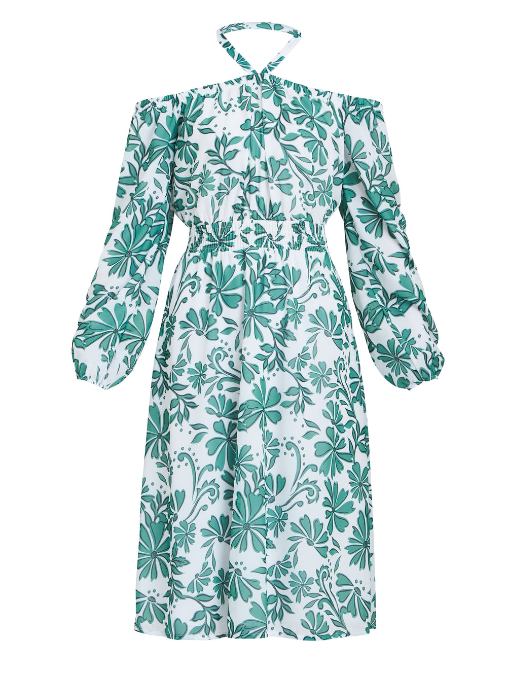 The Ryan dress is a beautifully feminine and breezy dress that perfectly balances casual and elegant wear. Featuring an off-shoulder midi dress with a flattering and slightly relaxed silhouette that flows gracefully, the bold and lively floral print in shades green and white give a summery feel to the dress. The neckline sits off the shoulder, beautifully framing the collarbone and the halter-style strap adds interest and style.