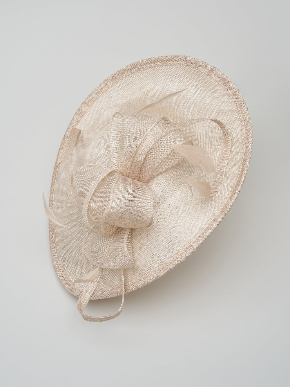 Our small sinamay disc is designed in a flattering teardrop shape, finished with delicate twirls, soft coque feathers and elegant sinamay loops. Stylish yet understated, it’s a timeless piece that suits all ages and is ideal for any special occasion. The lightweight disc sits securely on the head with a discreet double wire headband, ensuring comfort and confidence all day long.