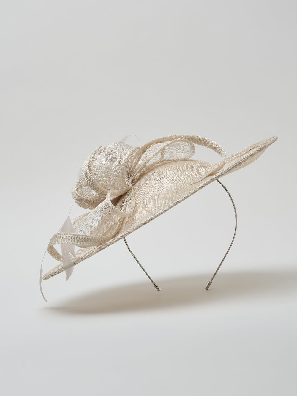 Our small sinamay disc is designed in a flattering teardrop shape, finished with delicate twirls, soft coque feathers and elegant sinamay loops. Stylish yet understated, it’s a timeless piece that suits all ages and is ideal for any special occasion. The lightweight disc sits securely on the head with a discreet double wire headband, ensuring comfort and confidence all day long.