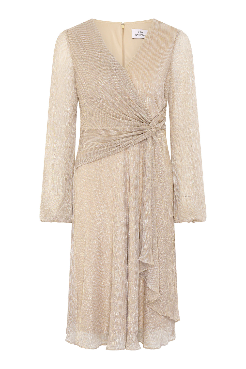 Shimmer with sophistication in the Stevie dress. Designed in a soft gold, this knee length dress features a flattering wrap style bodice and a chic knot detail at the waist to enhance the silhouette. The long sleeves add elegance, while the skirt drapes beautifully with every step. Dress is lined with sleeves unlined.