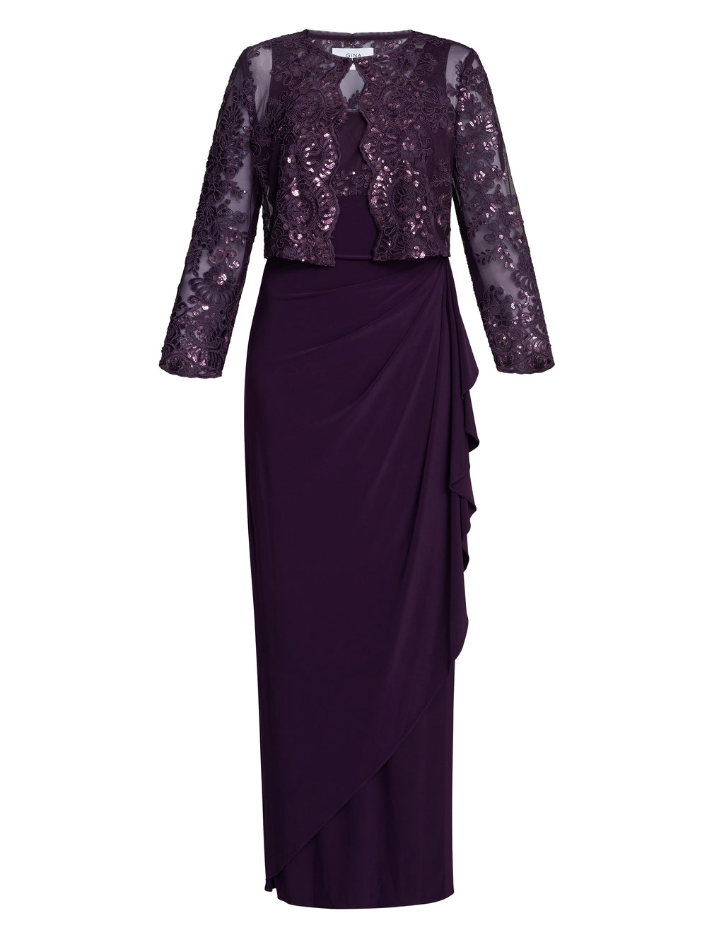 This elegant maxi dress features a figure-flattering silhouette with soft draping and a subtle side cascade detail. The matching lace jacket is designed with sheer long sleeves, and the neckline adds a delicate touch, while the rich purple enhances the sophistication of the entire look. Perfect for weddings, formal events, or any special occasion. Measuring 142cm and unlined.