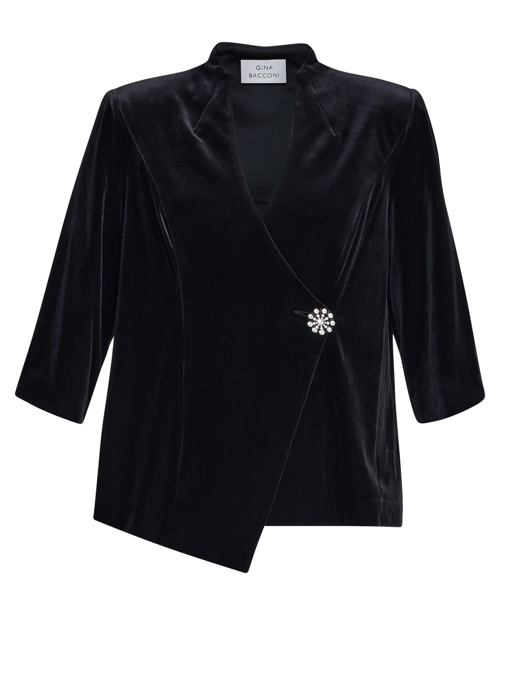 Elevate your evening look with our new Tayla velvet blouse in black. Made from velvet, this sophisticated top features a modern wrap silhouette with a brooch, a high neckline, 3/4 sleeves and a flattering asymmetrical hemline. Pair it with trousers or a sleek skirt.