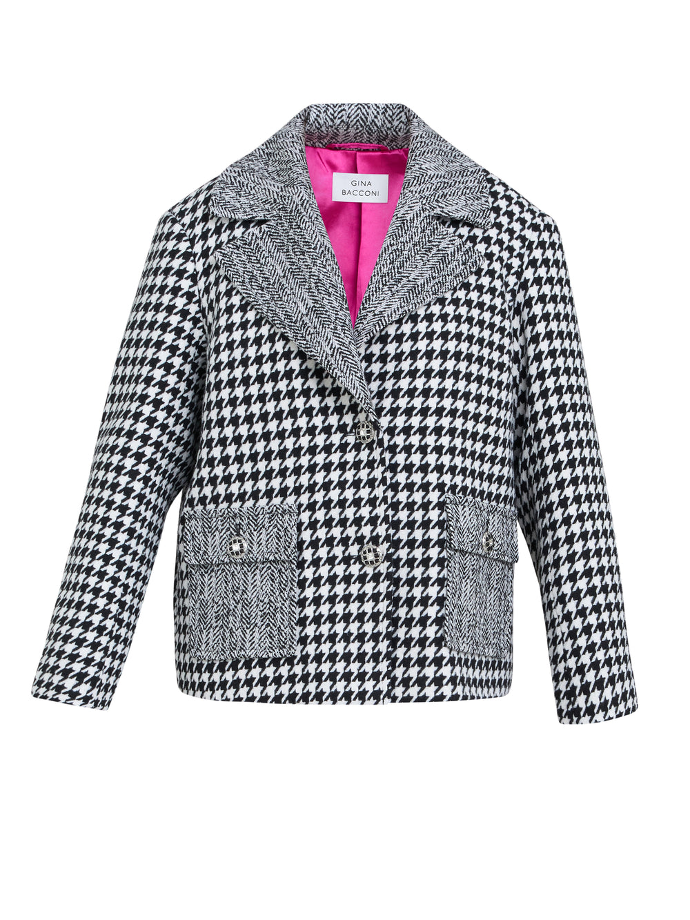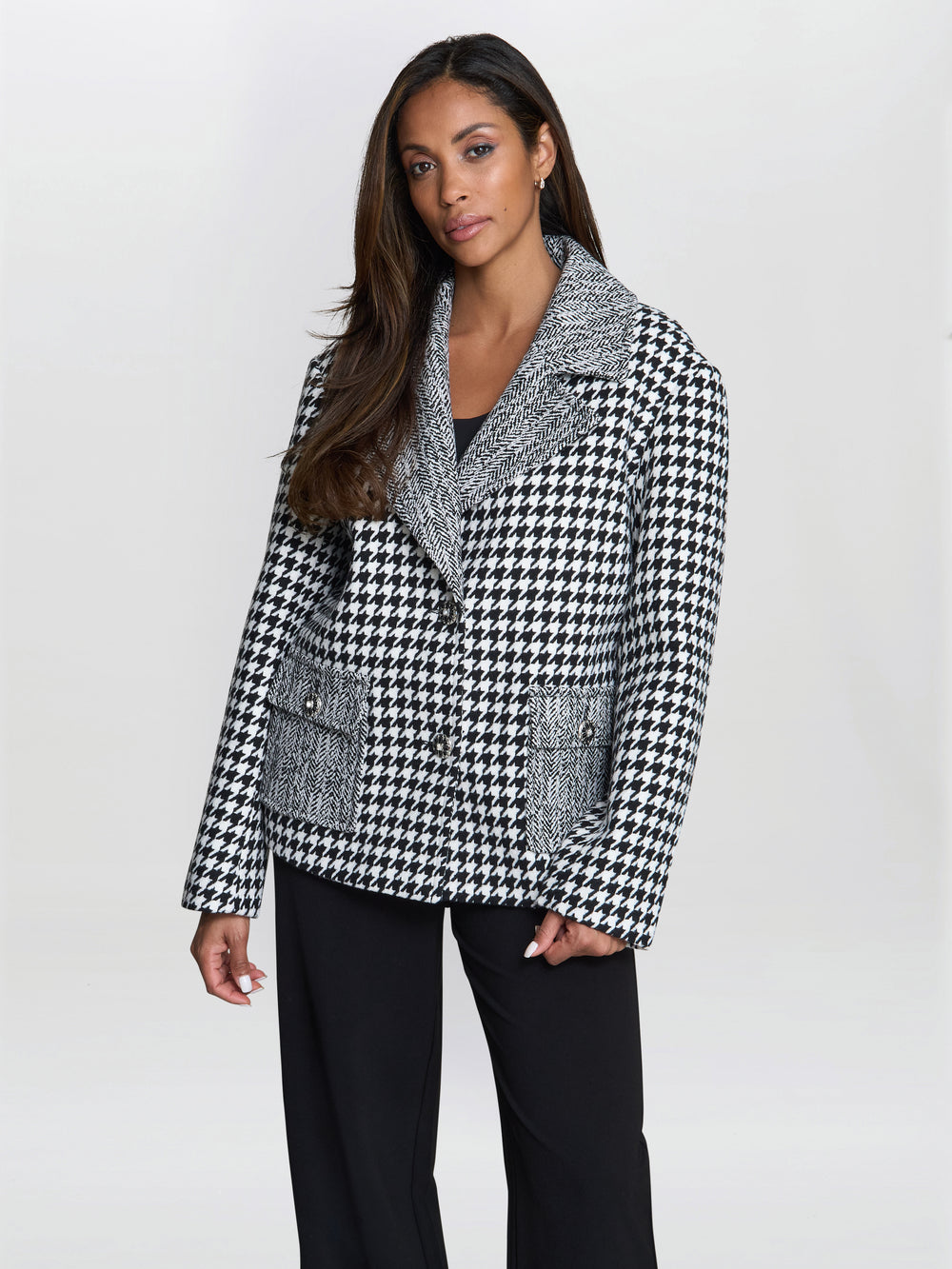This Wiktoria jacket is a bold blend of timeless pattern and modern design. Made from a cozy textured woven , this striking black and white jacket features a relaxed fit and wide collar offering effortless layering, while the button front closure and pockets bring both style and practicality.