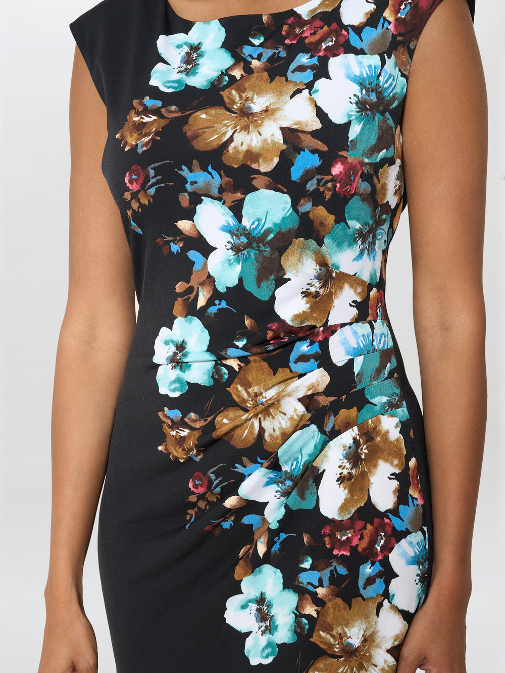 This dress is a striking and elegant piece designed to flatter the silhouette. Featuring a bold asymmetrical floral print in shades of blue, brown and white on one side, creating a visual interest. The boat neckline and sleeves add a refined touch, making it perfect for both daytime events and evening occasions.